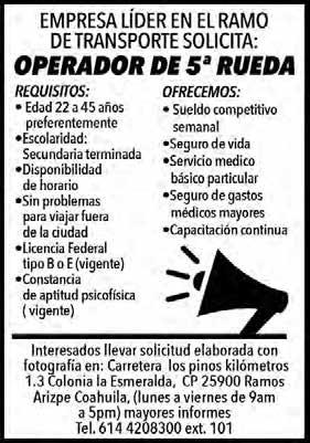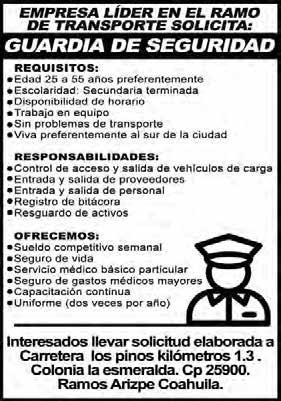 OFRECEMOS BUEN SUELDO, PRESTACIONES SUPERIORES A LAS DE LEY, EXCELENTE AMBIENTE DE TRABAJO. REQUISITOS INDISPENSABLES EDAD DE 18 A 45 AÑOS, QUE VIVA AL NORTE DE SALTILLO O EN RAMOS ARIZPE, SOLICITUD PRINTAFORM, 2 CARTAS DE RECOMENDACION, CARTA DE NO ANTECEDENTES PENALES.