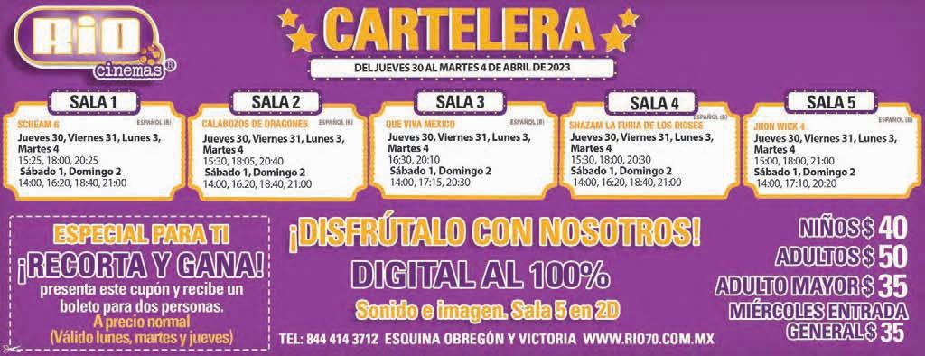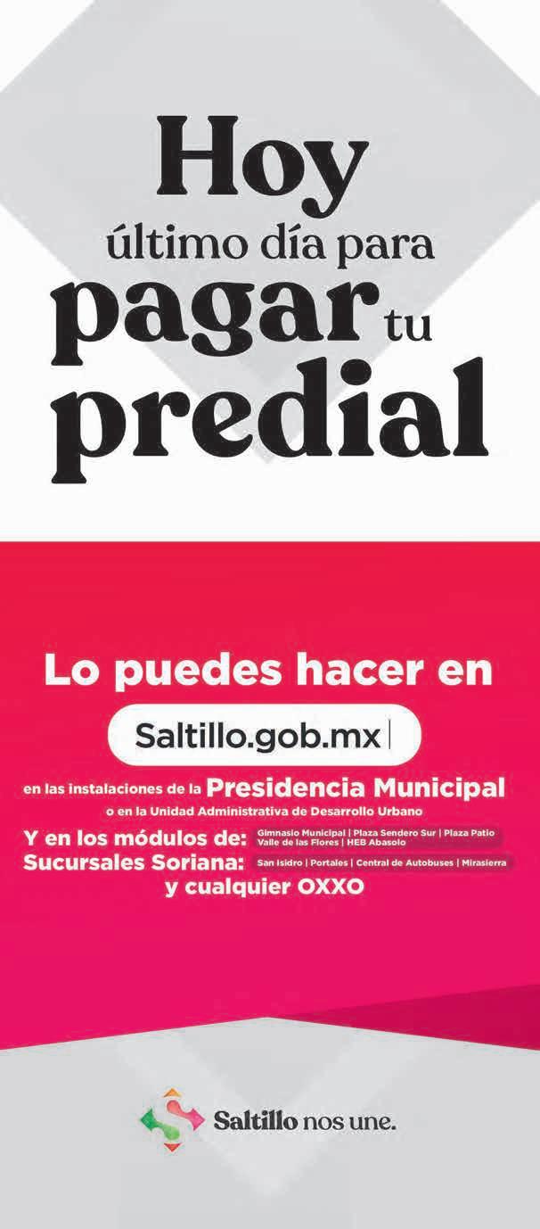 13-30. VIAJE A MAZATLAN, HOTEL STAR PALACE, C/ PLAYA. 27 AL 31 DE JULIO, 5 DIAS Y 4 NOCHES. INFORMES. 844-198-34-50 VIAJES ECONOMICOS SALIDAS DIARIAS A CD DE M E X I C O, QUERETARO Y CHIAPAS 20.30 PM Y 22.00 PM RESERVACIONES AL 844-56775-99 EVENTOS VIDEO JUEGOS A COMISION, BUENAS GANANCIAS. 844-870-35-38 JUEGOS INFANTILES .A BAILAR $300 BRINCOLINES; MOBILIARIO, TORO, TOLDOS, AL 844417-73-50 Y 844162-60-48 MOBILIARIO CAPELOS, SILLAS, MESAS Y MANTELES 844-417-7350 Y 844-162-60-48 VARIOS OTROS DIOS TE. AMA. INFORMES .844-622-53-74 TE GUSTARIA VERTE Y SENTIRTE MEJOR..INFORMES 844-622-53-74 8F Clasificados ZÓCALO SALTILLO Viernes 31 de marzo del 2023 VARIOS INTENDENTES ELECTRICIDAD INTENDENTES