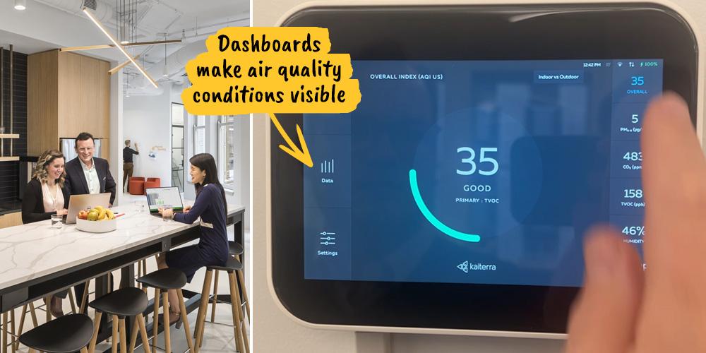 Self-control draws on energy, and that energy must be replenished. Breaks, movement, daylight, hydration, and ergonomics aren’t perks—they’re prerequisites for sustained performance. In Perkins Eastman’s Chicago office, wellness is built into the environment: air quality dashboards make conditions visible, subtle cues encourage posture changes and hydration, and healthy food options support better defaults.