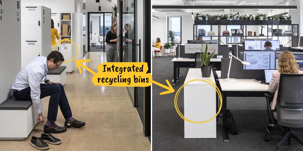 Even when employees want to do the right thing, convenience often wins. A plastic bottle goes in the trash if no recycling bin is nearby. Perkins Eastman’s Pittsburgh office is designed for effortless sustainability: recycling and landfill bins sit side by side; paper recycling is next to trash in workspaces; the kitchen has separate bins for trash, glass/metal/plastic, paper/cardboard, and compost near the coffee machine. By removing small points of friction, employees make sustainable choices without thinking—saving energy for the work that matters most.
