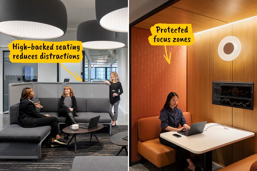 Collaboration gets a lot of attention, but protected focus time matters just as much — and furnishings can safeguard it. At NFP’s corporate relocation, two-person booths enclosed on three sides reduce distractions and support concentrated work. Edison Properties approached the challenge differently when relocating to Ironside Newark: sofa backs rise just above seated head height, defining and shielding a breakout area from visual distractions as people move through the space.