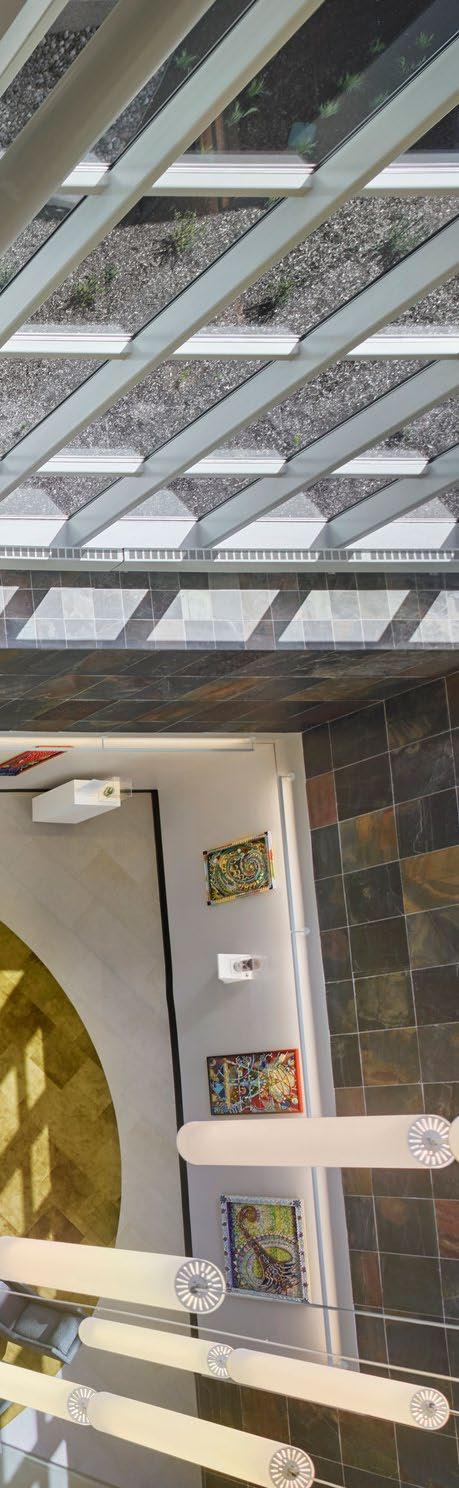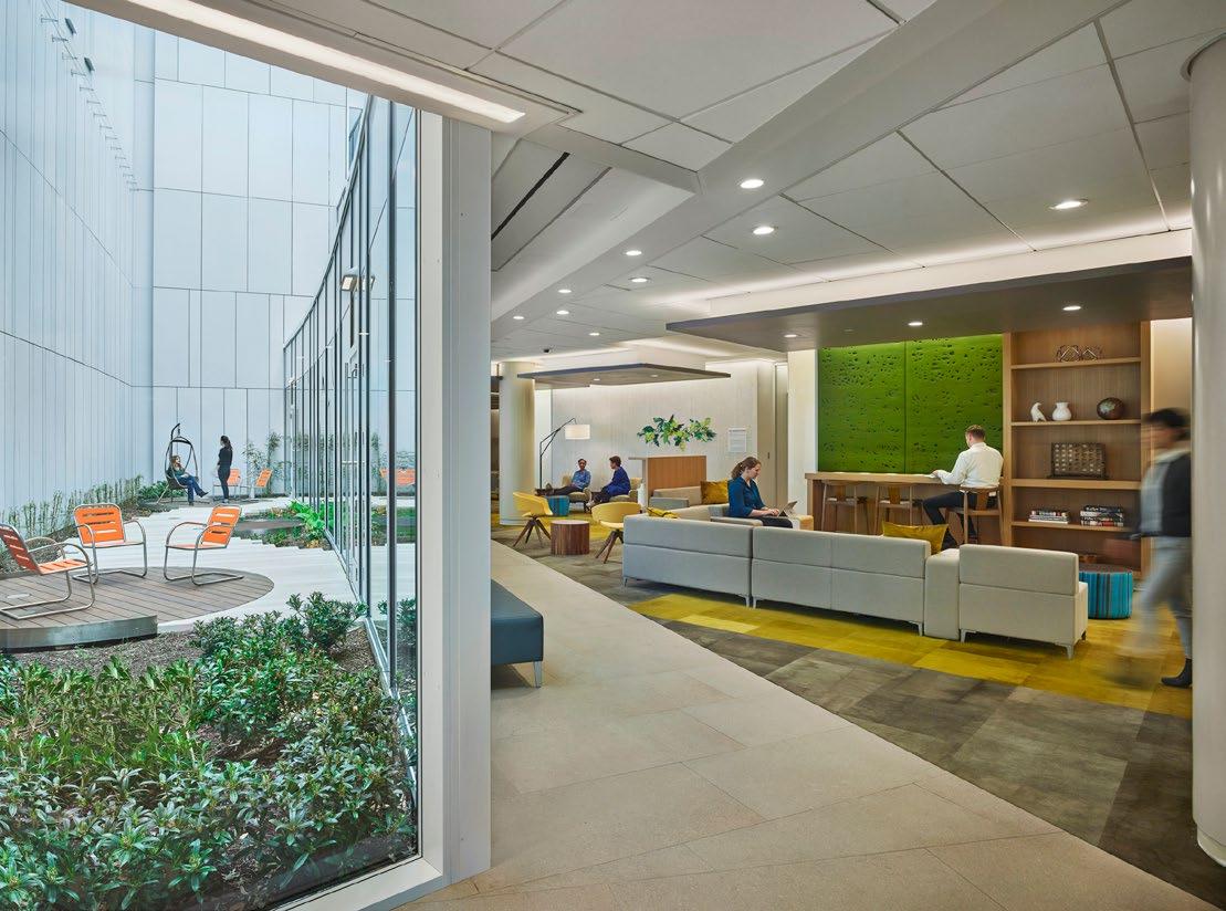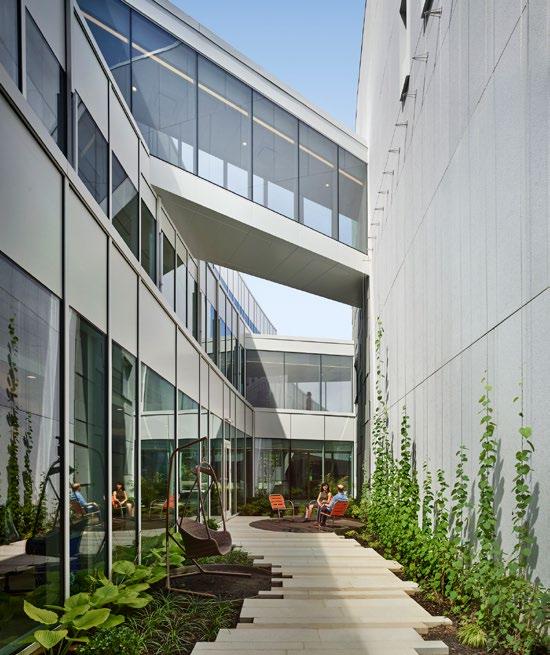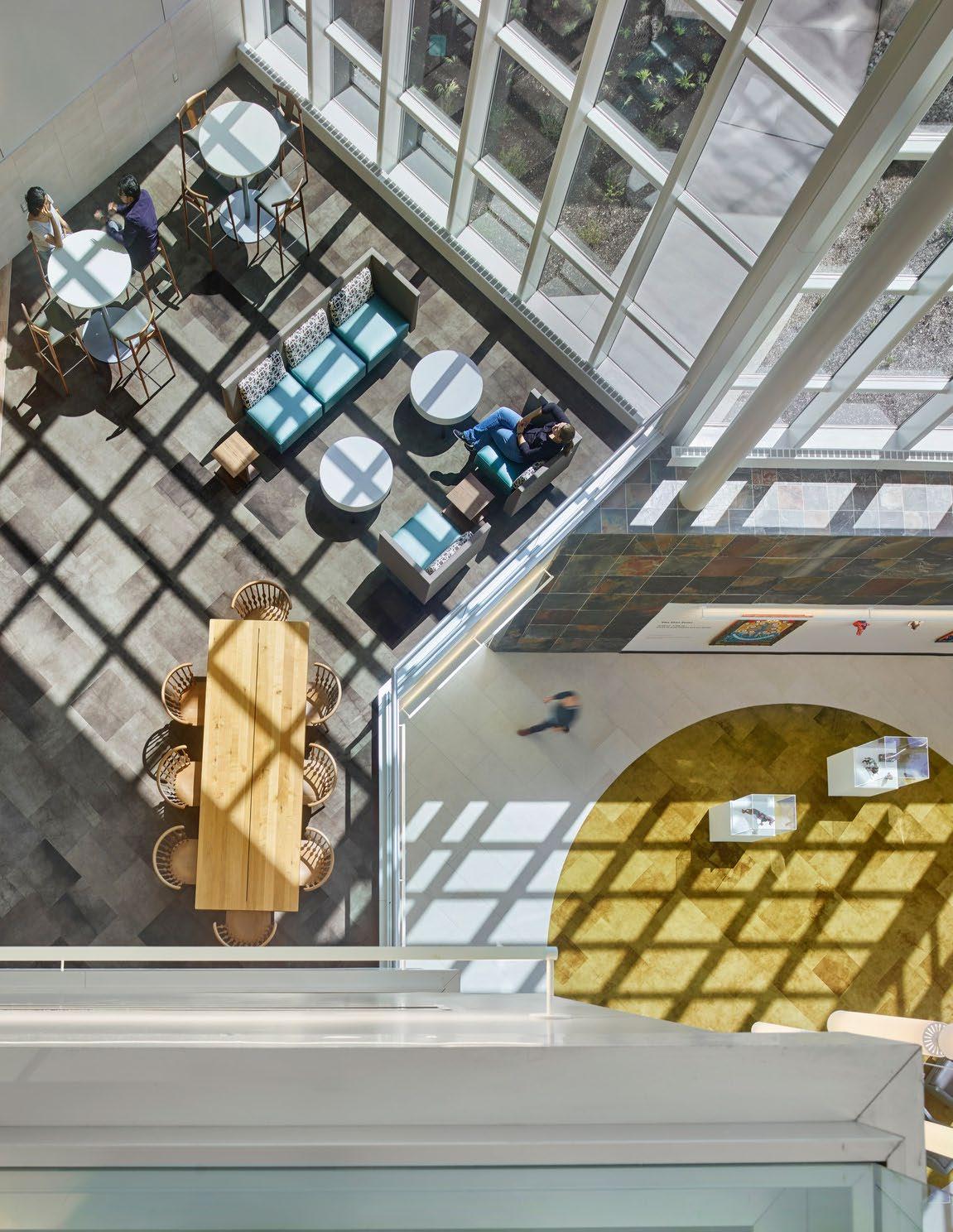 To enhance patient arrival and wayfinding and increase natural light and views, a three-story courtyard bisects the floorplate, following the arc of the sun. Upper-level glass-enclosed bridges connect patient areas and amplify the courtyard experience.