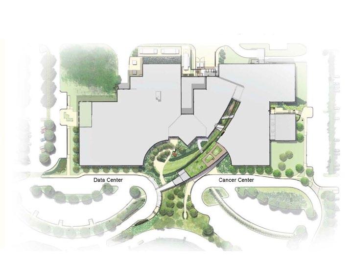 Addressing the need for a defined sense of place with an overarching desire to āembraceā the patients, staff, and visitors, the buildingās large, semi-circular plan with a curved connecting bridge between the outpatient cancer center and the existing inpatient care buildings provides a clear, civic sense of arrival.
