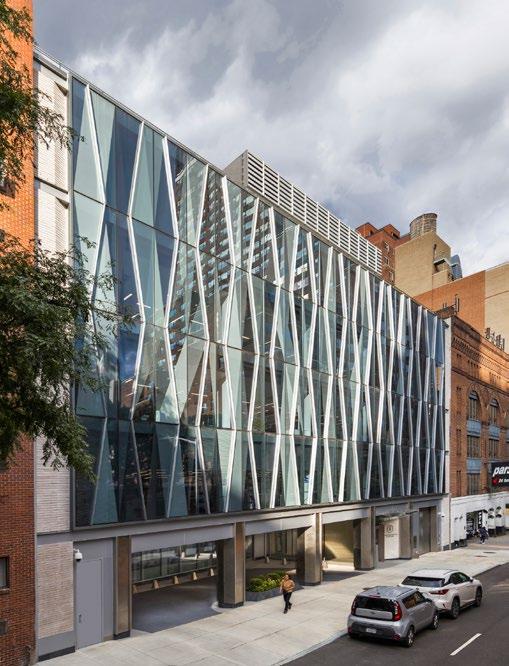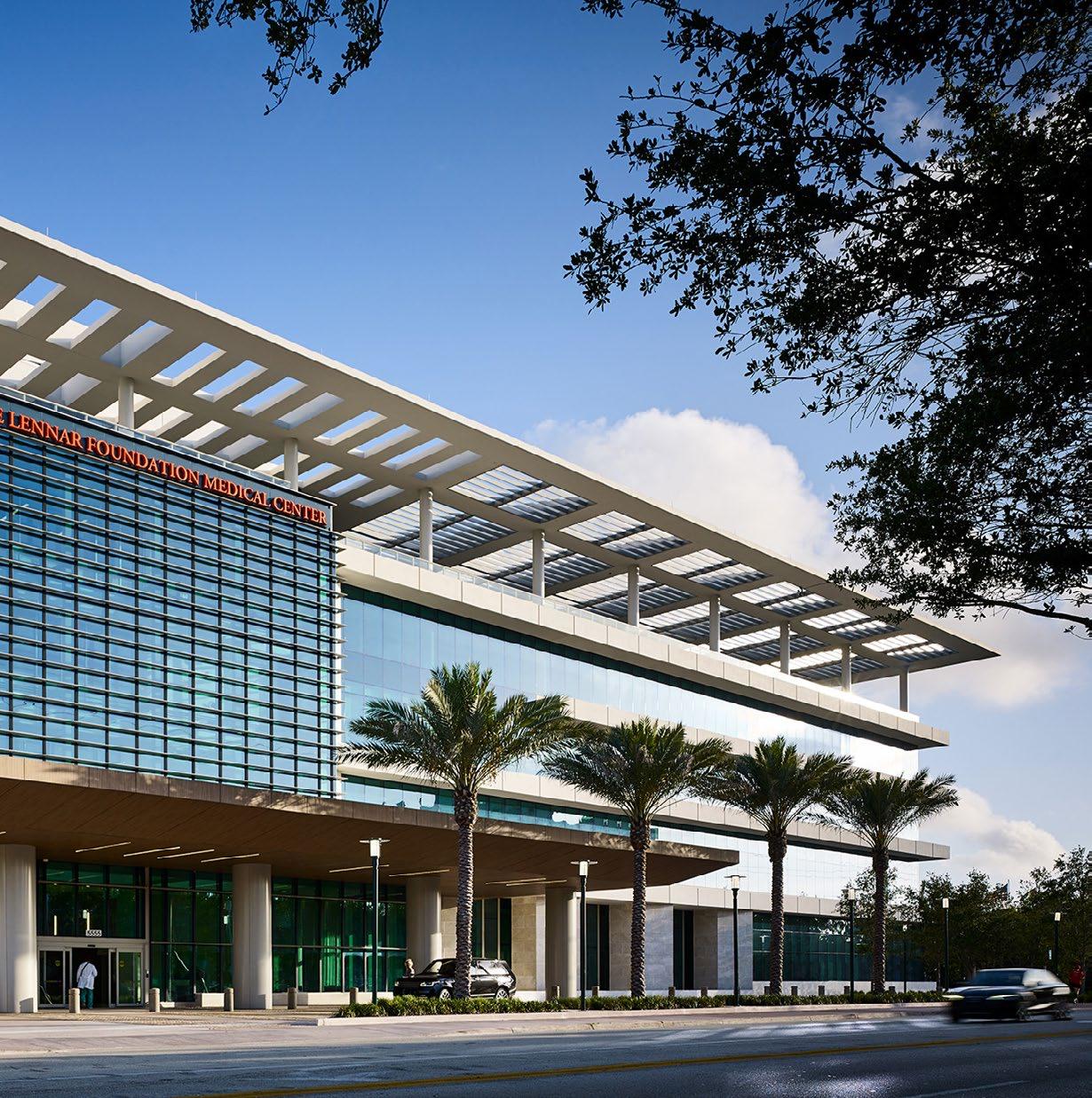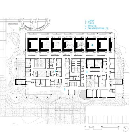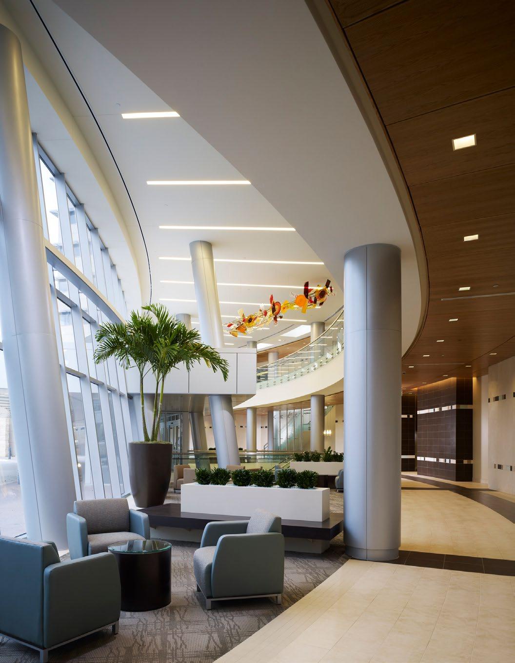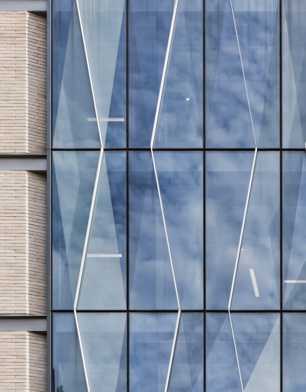 The full-height glass curtain wall employs a solarresponsive pattern that limits solar gain and glare, while evoking DNA mapping used in advanced cancer treatment.