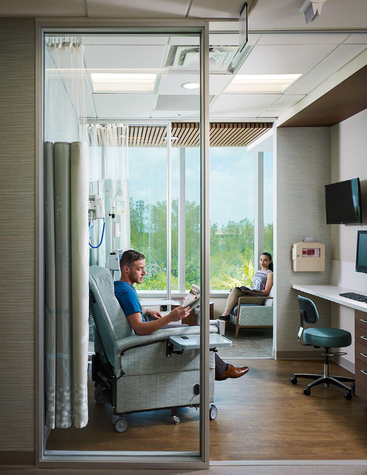Stepped 6-chair private infusion pods allow all patients panoramic views of nature and staff visibility of their faces throughout chemotherapy.