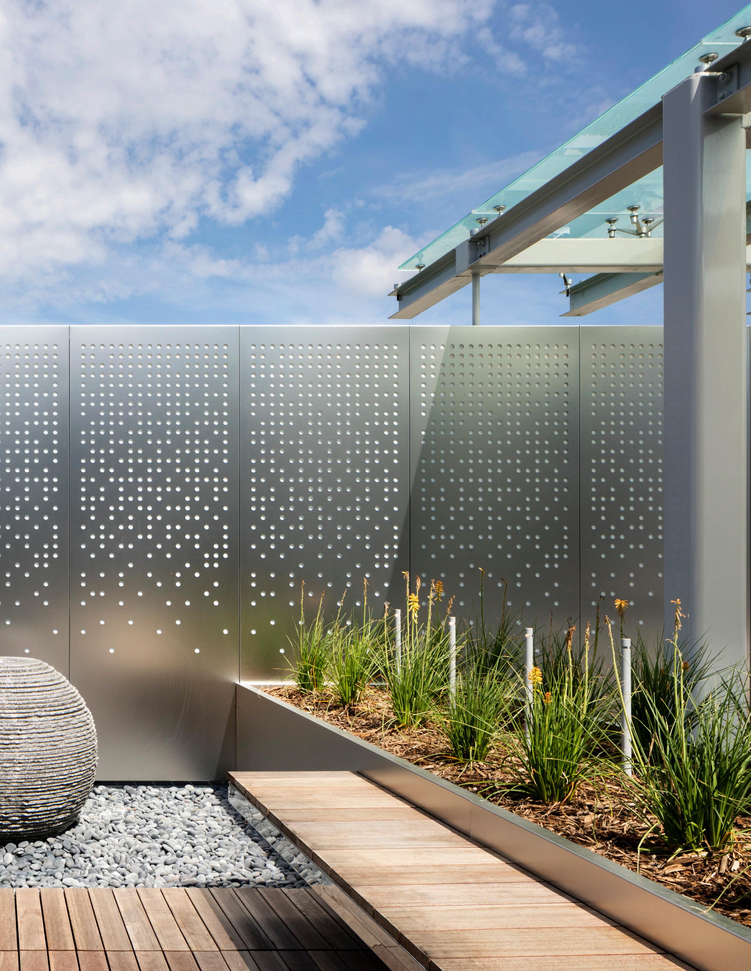 A sea of panicum grass provides movement and visual interest, encouraging staff to take a break from the screen.