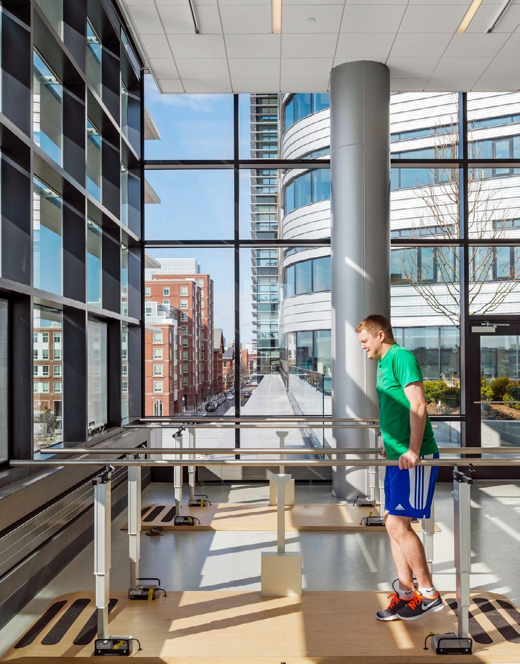 Inpatient and outpatient gymnasia share equipment and are visually connected to clearly demonstrate treatment progress.