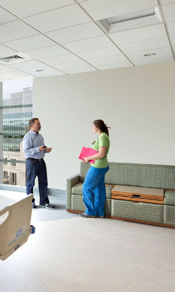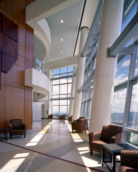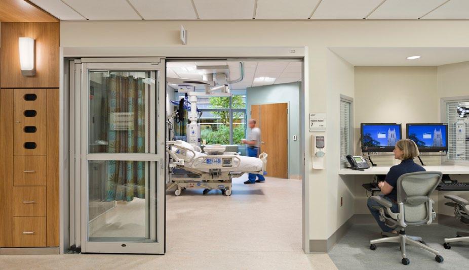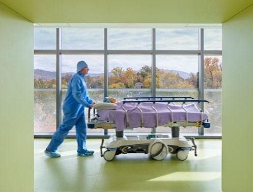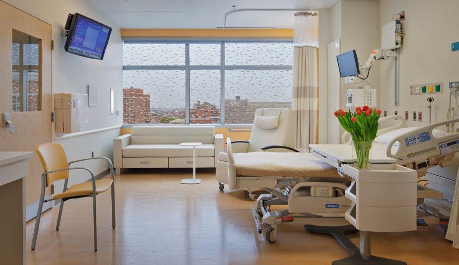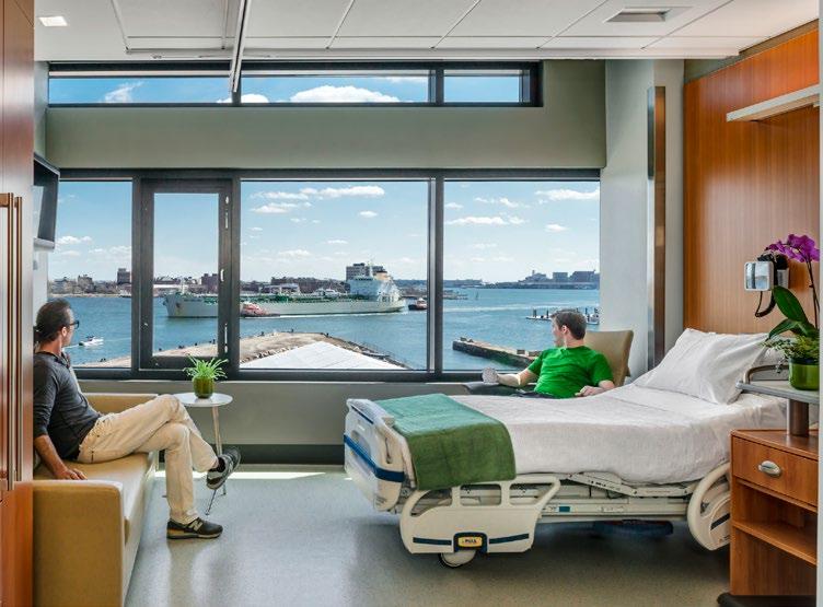 The ICU patient room provides views to courtyards and gardens, maximizing access to natural light and improving the speed of patient recovery; Twostory main lobby; The new patient rooms feature floor-to-ceiling glass and overhead boom service delivery to encourage the transition from bed positions that support enhanced caregiver access.