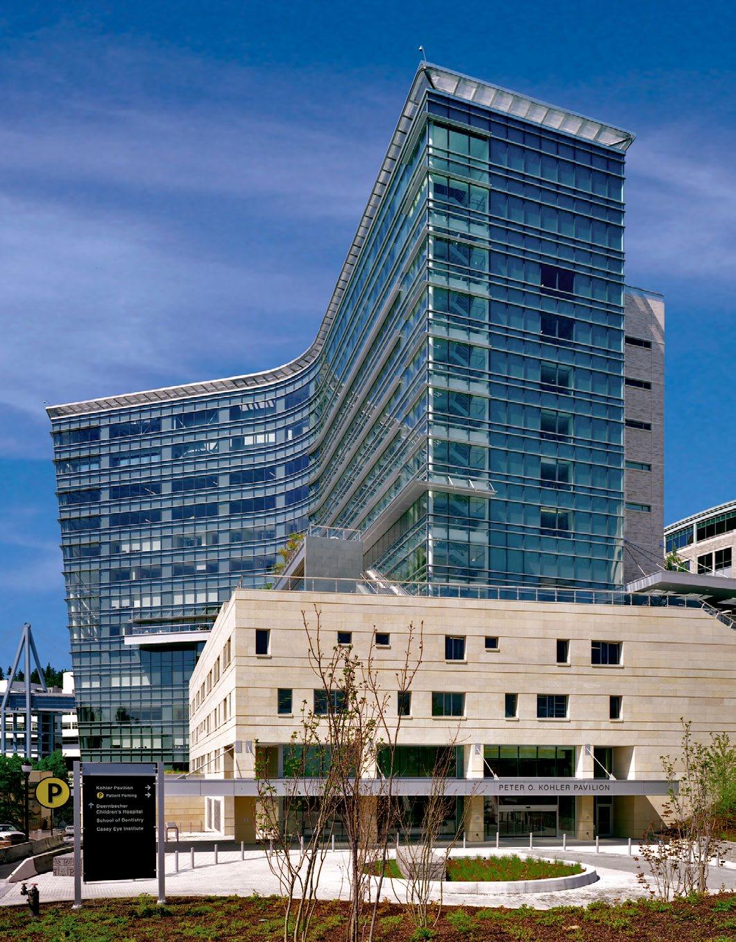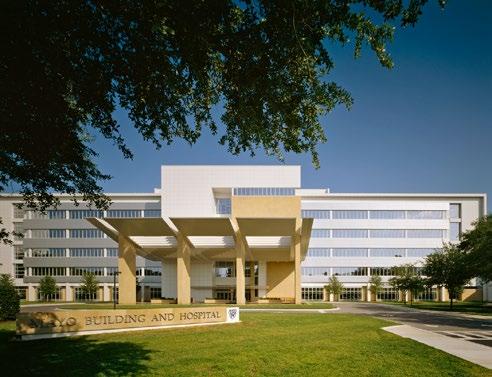 The hospital has 214 beds in a six-floor tower connected to the existing Mayo building. A sweeping canopy marks the main entry to the hospital.