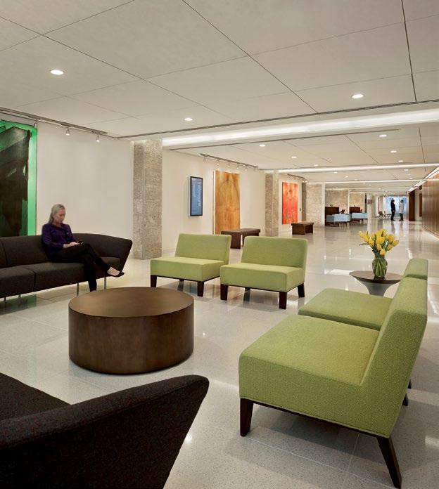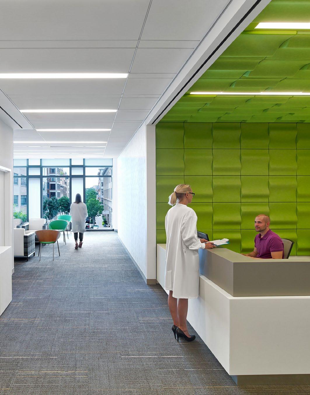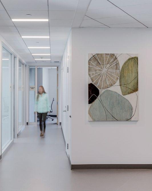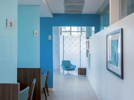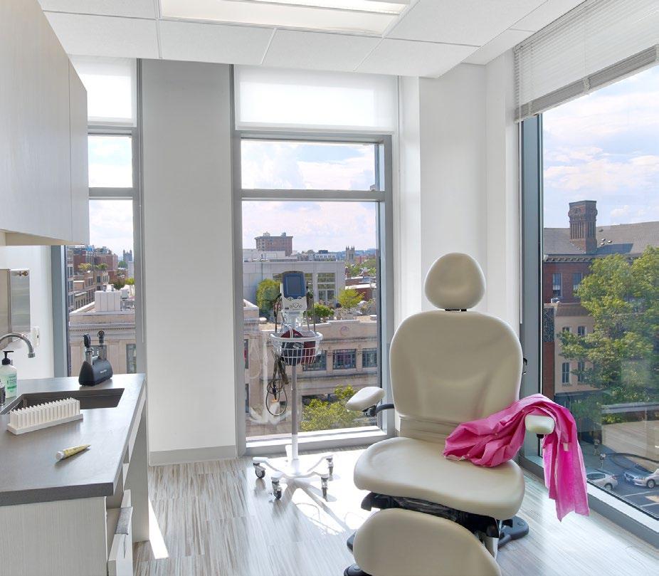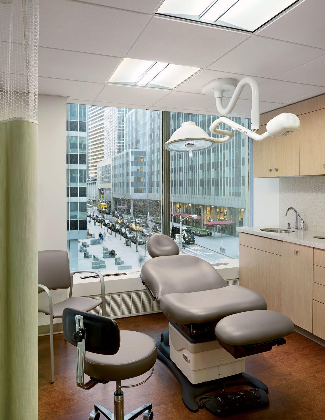 Clockwise from Top Right: Practices are organized along a central spine, with individual waiting areas that express individual practice identity through art, color, design, and furnishings; A connecting stair promotes active design; Treatment bays prioritize views and natural light.