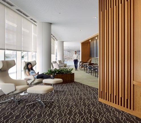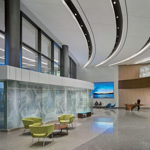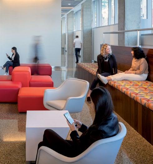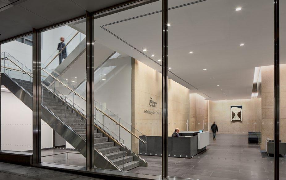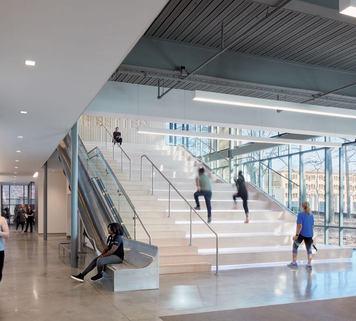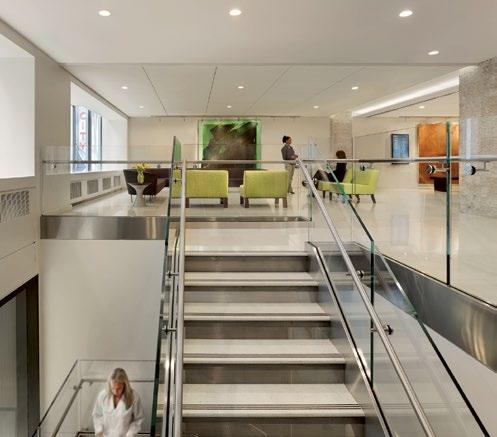 Monumental communicating stair connects the main lobby with an amenities floor and respite area promoting movement and social cohesion for staff and visitors alike