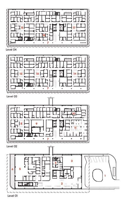 Clockwise from Top Right: Staff side corridor doubles as a meeting space; Communal lounge space; Exterior view of the medical building.