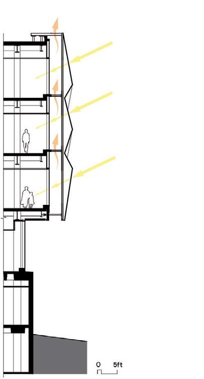 Clockwise from Top Right: East-West Section; Wall Section South Façade; View from Southeast