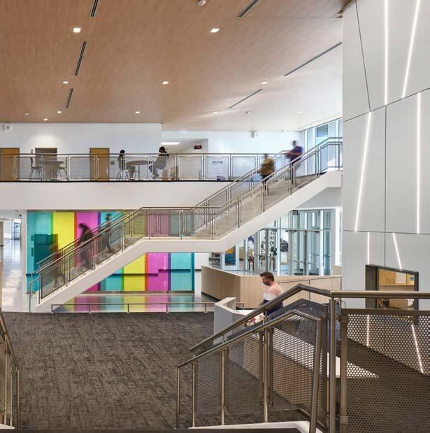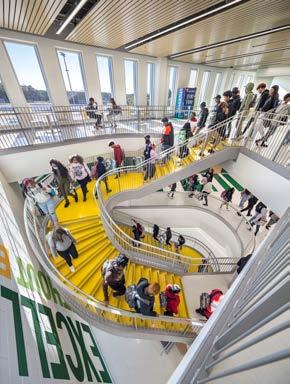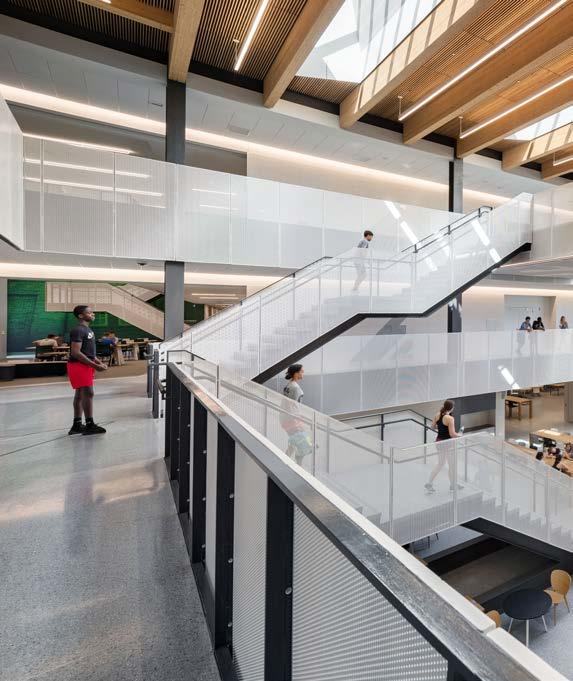 A monumental staircase sits within the multistory rotunda volume overlooking the outdoor courtyard, giving the school a college campus feel and motivating students to step outside.