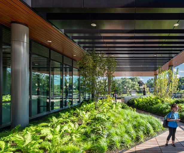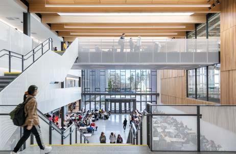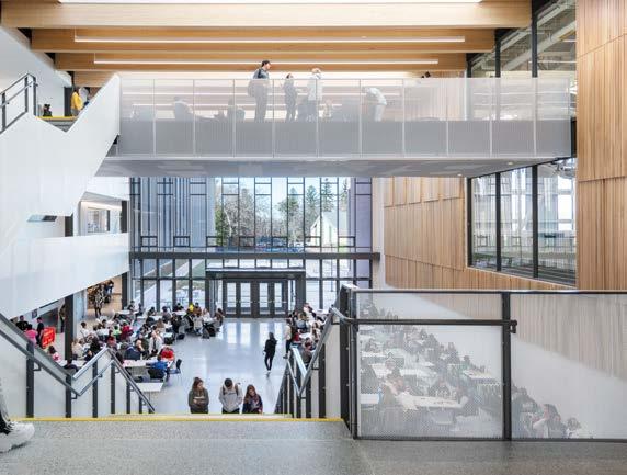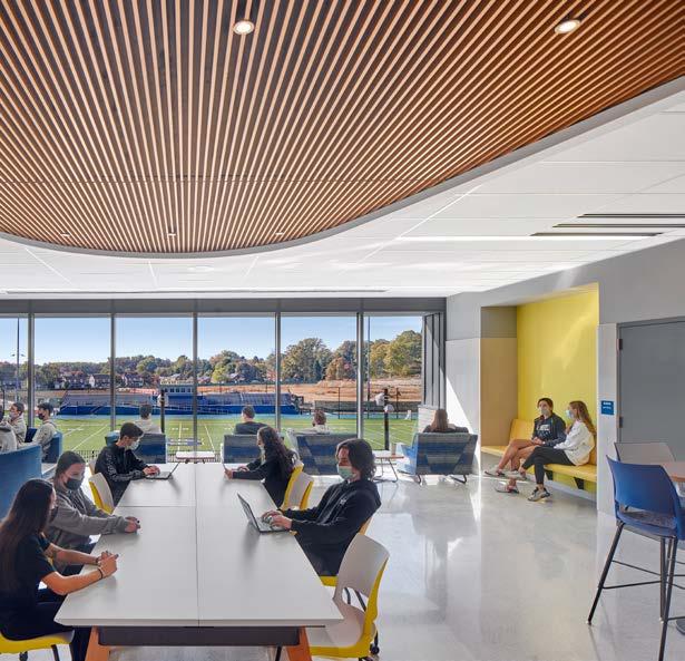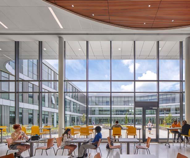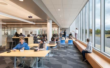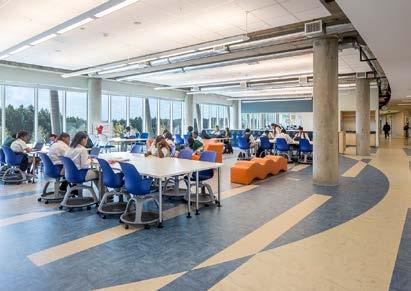 The central commons allows access to the biophilic experience of the adjacent pond during study periods, dining, and after school events.