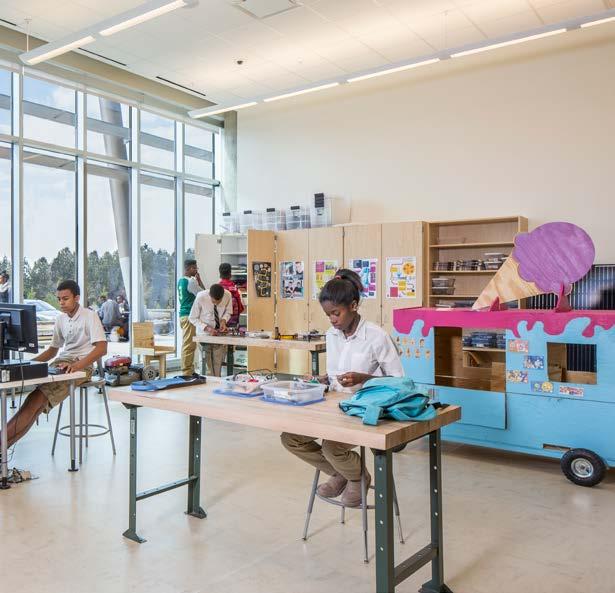 The school features an open, collaborative media center and makerspace.