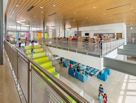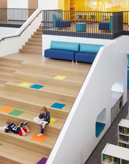 The learning commons/ media center serves as a central learning hub and features stadium seating benches.