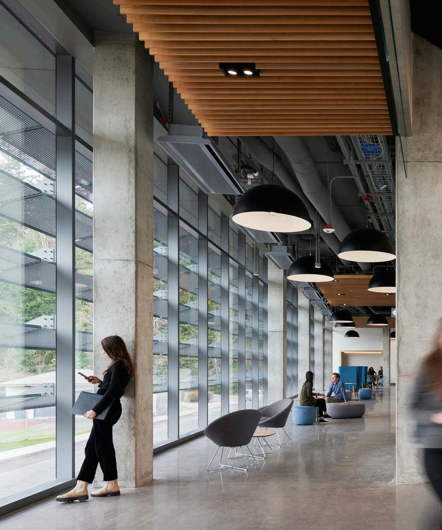 With these core values in mind, we designed a flexible, collaborative and highly sustainable building. Large landings on the open stair and breakout spaces with soft seating create connections between students, faculty, and researchers. Innovative solar glass fins put science on display while generating enough electricity to light 12,400 square feet of offices year round. And a greenhouse located just a couple steps from Seattle’s largest pedestrian trail encourages the community to engage with the University and discover the science happening within.