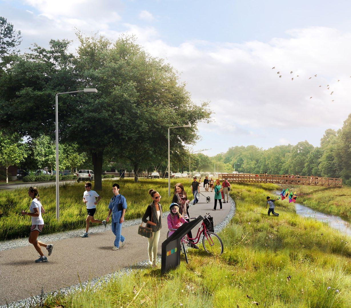 The Health Loop concept transforms a derelict stormwater channel into a naturalized stream with trails connecting hospitals in the District.