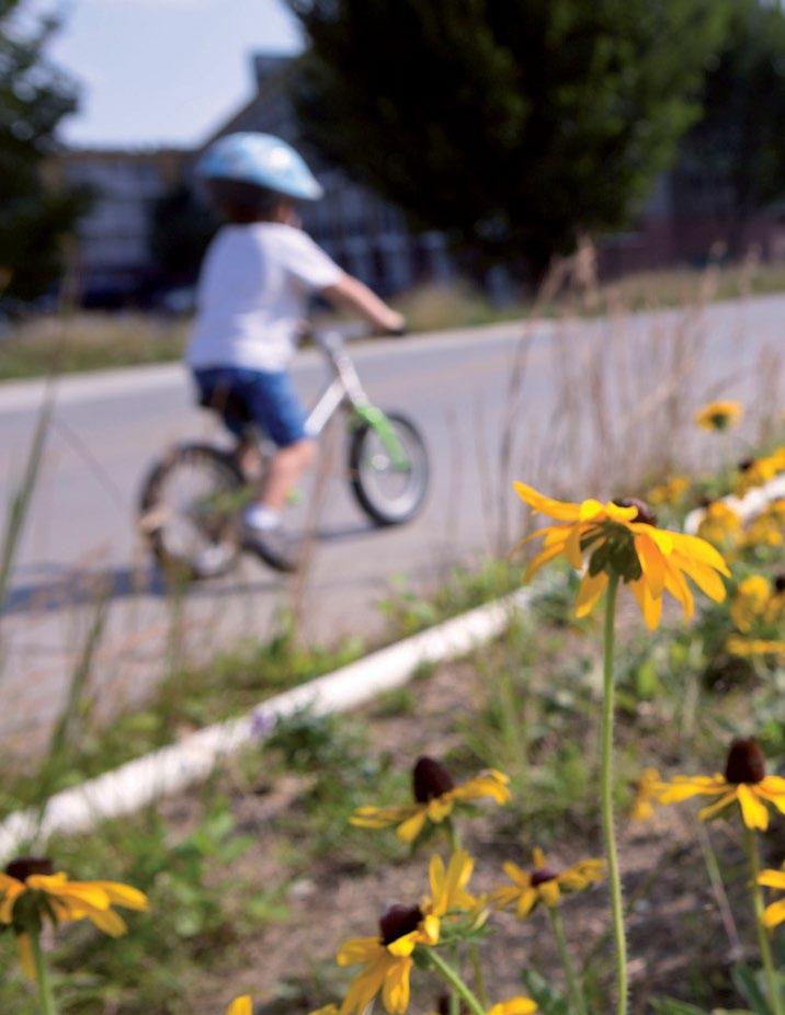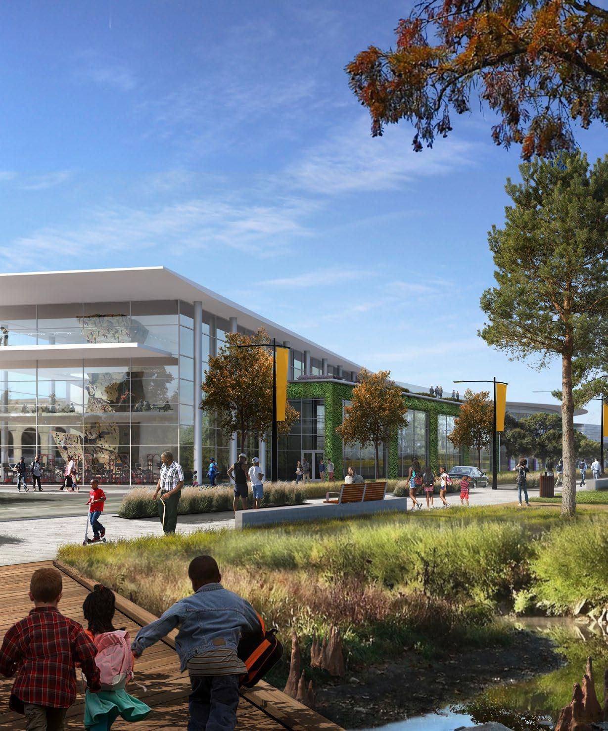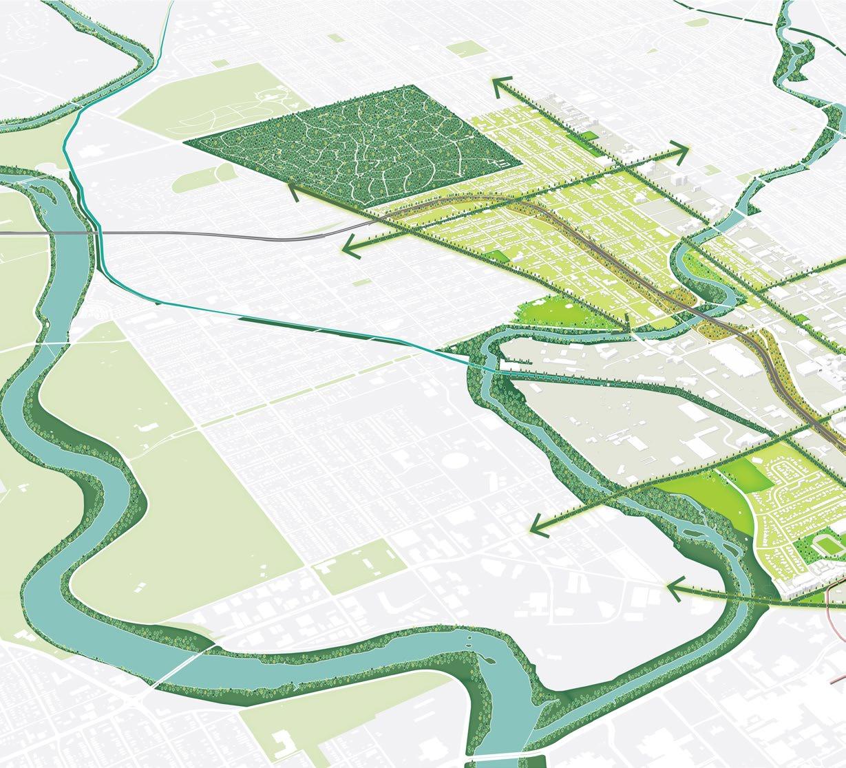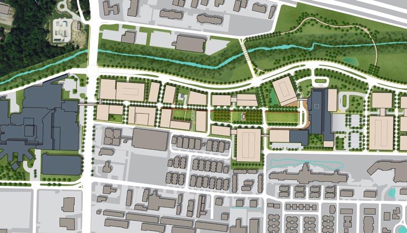 A car-centered children's hospital campus is transforming into a walkable district that supports community uses and spaces for staff and families with children. The long-term vision achieves the highest and best use of campus real estate, accommodating phased growth of the hospital, five blocks for private development and shared parking. The plan is centered on a signature park and tree-lined avenue that links the Children's Hospital to the health system's flagship campus to the west. A one-mile nature loop supports engagement and education on healthy habits and urban farming, through linking city trail networks with nearby museums and gardens.