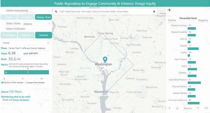 Design Equity (PRECEDE) is our open-source dashboard that integrates and translates public health data, previously found silo in multiple locations, into one consolidated location. By leveraging several databases—such as the U.S. Centers for Disease Control, the Environmental Protection Agency, the U.S. Census Bureau, and others—PRECEDE enables understanding of site-specific health considerations and development of health-responsive design.