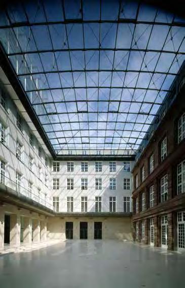 Approx. extensive glazing without of horizontal transoms, cantilevered steel roof structure, façade with glass glazing joints, inside a spacious and naturally lit atrium extends up to the roof, outside 1,840 sqm steel and glass stick system façade with horizontal glass glazing joints, natural stone façade, the load-bearing components of the façade are T-profiles welded from sheet metal with a 330 mm deep web and an 80 mm wide flange, aluminum nose is flush with the glass on the outside, 7 m long vertical steel T-profiles and 80 glass panes
