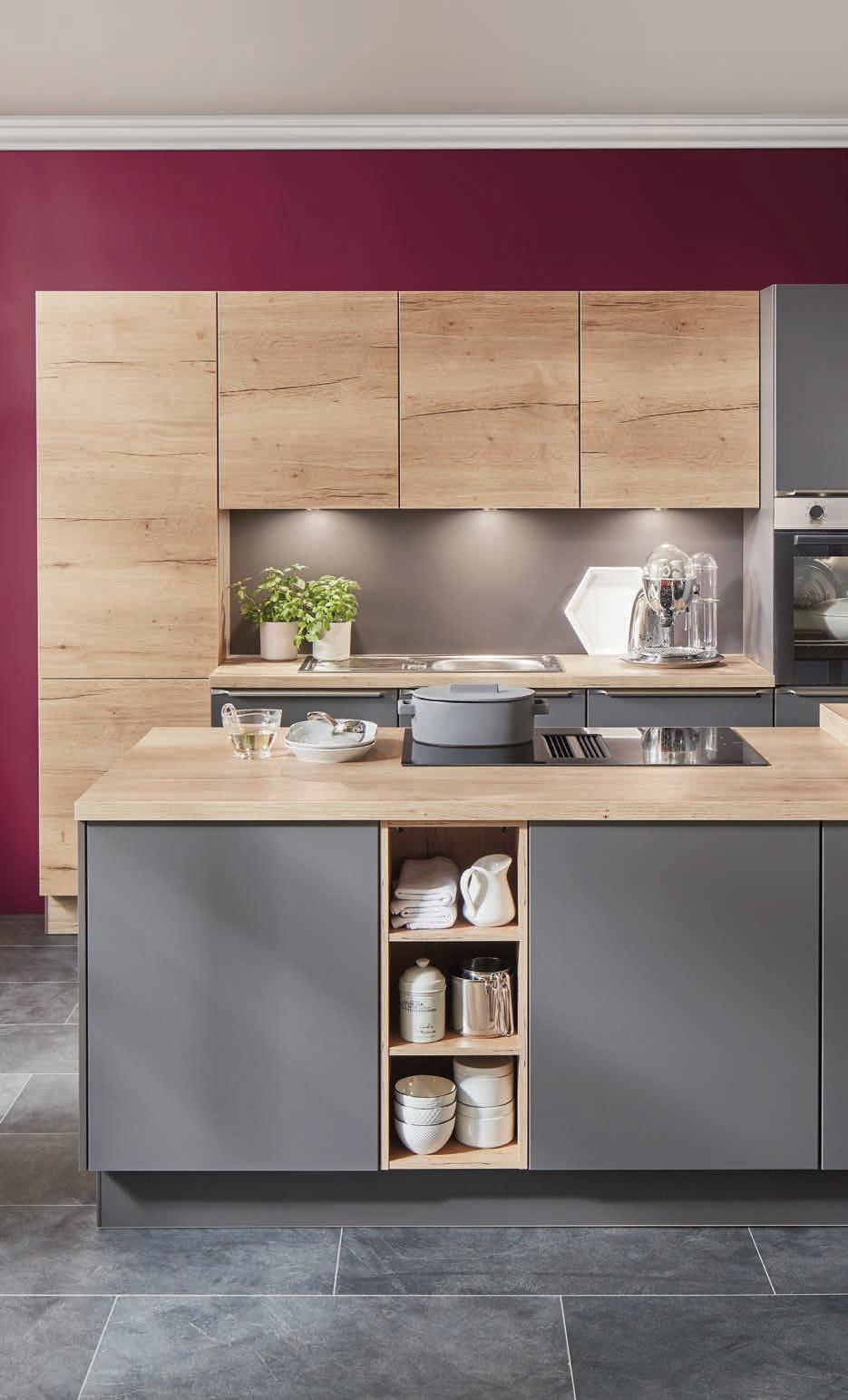 Küche mit freistehender Kochinsel Nobilia Touch / Structura ca. 360 / 172 x 125 cm, Front: Lacklaminat, Schiefergrau supermatt / Eiche Sierra Nachbildung, Arbeitsplatte: Eiche Sierra Nachbildung
