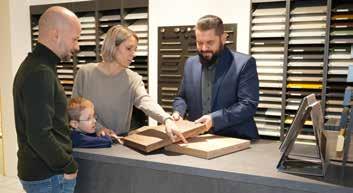 Küchenberatung bei Küchenberater Michael Scherpf an Musterwand mit Vielzahl an Front- und Arbeitsplattenmuster in Schichtstoff, Keramik, Glas, Quarzstein, Massivholz etc.