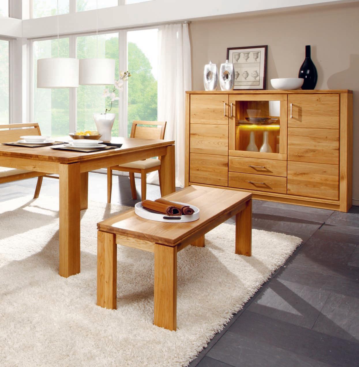 Essgruppe: Säulenesstisch ARU-362135, Stuhl ARU-453100, Armlehnstuhl ARU-454100, Einzelbank ARU-402120, Sideboard ARU-152120 und Highboard ARU-153100.