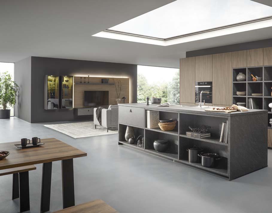 Die großzügige Wohnküche lädt förmlich dazu ein zur Ruhe zu kommen und zu Verweilen. Auch was die optischen Elemente angeht: Eine Kombination aus modernem Design und natürlichen Materialien, in diesem Fall warmes Holz und kühle Schiefernachbildung, verzaubern die Sinne, noch bevor man zum Kochen angefangen hat. Holz trägt Wärme und Natürlichkeit bei und rundet das Gesamtbild durch stilvolle Klarheit ab. Mithilfe der Architektur wird eine Extravaganz geschaffen, die durch die schlichte Anmutung modern und zeitlos wirkt.