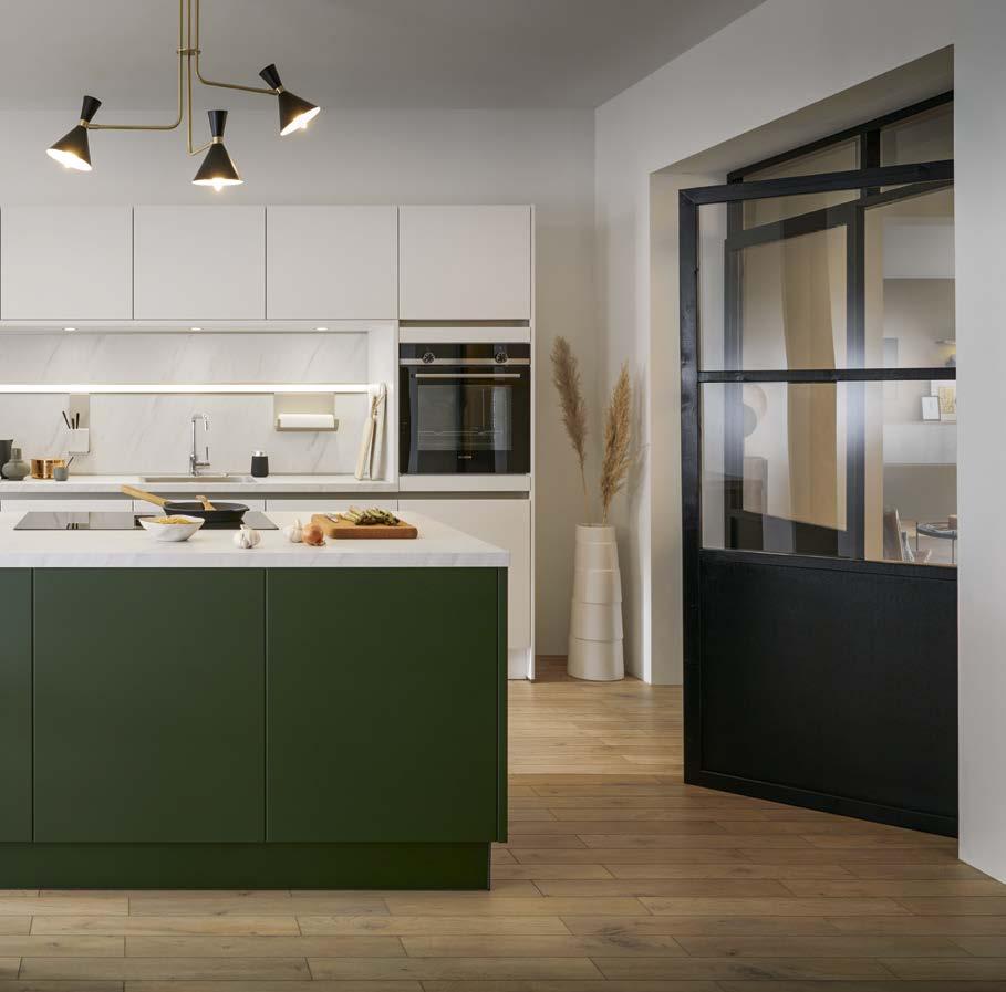 It‘s all about the colour! So setzen Sie nicht nur einen Akzent, sondern ein Statement. Die Trendfarbe Waldgrün hat den Weg in die Küche gefunden. Das Zusammenspiel dieser tiefen, dunklen Farbigkeit in Lack samtmatt und der zweiten Frontfarbe in Kristallweiß Lack samtmatt in Kombination mit der zart wirkenden Marmoroptik von Arbeitsplatte und Nische erzeugt einen klassischen Look, der ganz subtil mit einem Hauch Vintage spielt. Funktionale Highlights sind das Nischenpaneel, das Küchenutensilien ansprechend ordnet und das stilvolle Kochfeld mit Muldenlüfter. Der coole Barwagen sowie der Hocker im Industrial-Look brechen das lineare Muster der Küche dezent auf und runden das Bild optimal ab.