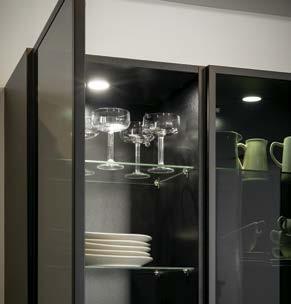 Die schwarzen Glasvitrinen zeigen durch das Ultragreyglas Einblicke ohne alles direkt zu offenbaren. So blenden die LEDLampen nicht, wenn Abends die Beleuchtung eingeschaltet wird.
