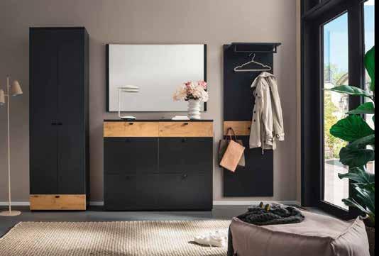 GARDEROBENKOMBINATION EM BASTOGNE, Korpus Anthrazit matt, Fronten Wildeiche und Anthrazit matt, best. aus: SCHUH-KLAPPSCHRANK, Schuhe, BHT ca. 118 x 100 x 34 cm, BHT ca. 59 x 180 x 30 cm.