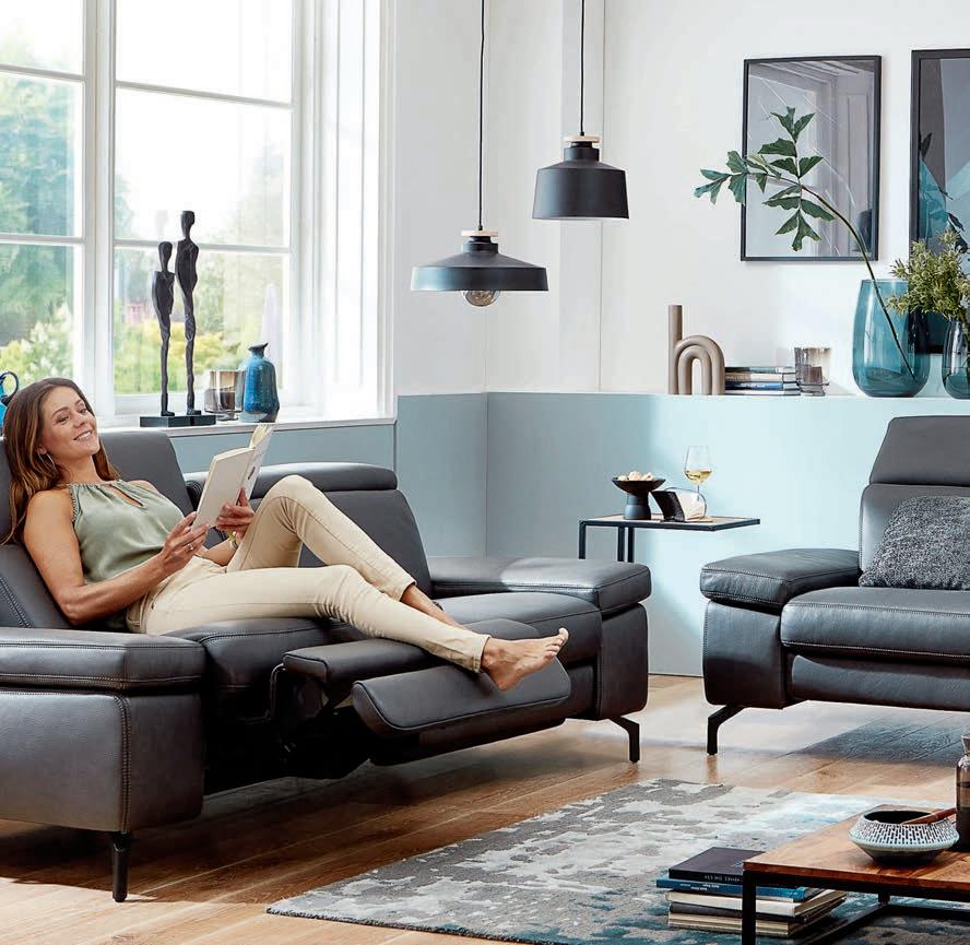 Trotz des hohen Rückens benötigen Sie beim Einsatz der elektrischen Relaxfunktion nur wenig Abstand zur Wand, der Sitz fährt nach vorne und lässt sich dann kombiniert – oder in der Premium Version einzeln – vom Neigungswinkel des Rückens und des Fußteiles individuell Ihrem Empfinden anpassen. Das ist Wohlfühlen pur. Mehrpreis ab 548,-