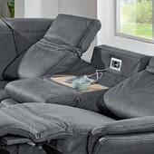 Beim Trapezsofa befindet sich im Mittelteil des Rückens ein eingebauter Tisch, den man einfach nach vorne klappen kann, um den Mehrwert einer Ablage nutzen zu können. Auf Wunsch kann hier sogar eine Steckdose mit USB-Anschluss integriert werden. Mehrpreis Steckdose 198,-