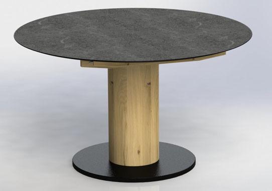 • Dieser Tisch mit runder Tischplatte mit Facettenprofil inkl. Synchronauszug kann in zwei Massivhölzern und 3 HPL Ausführungen konfiguriert werden: