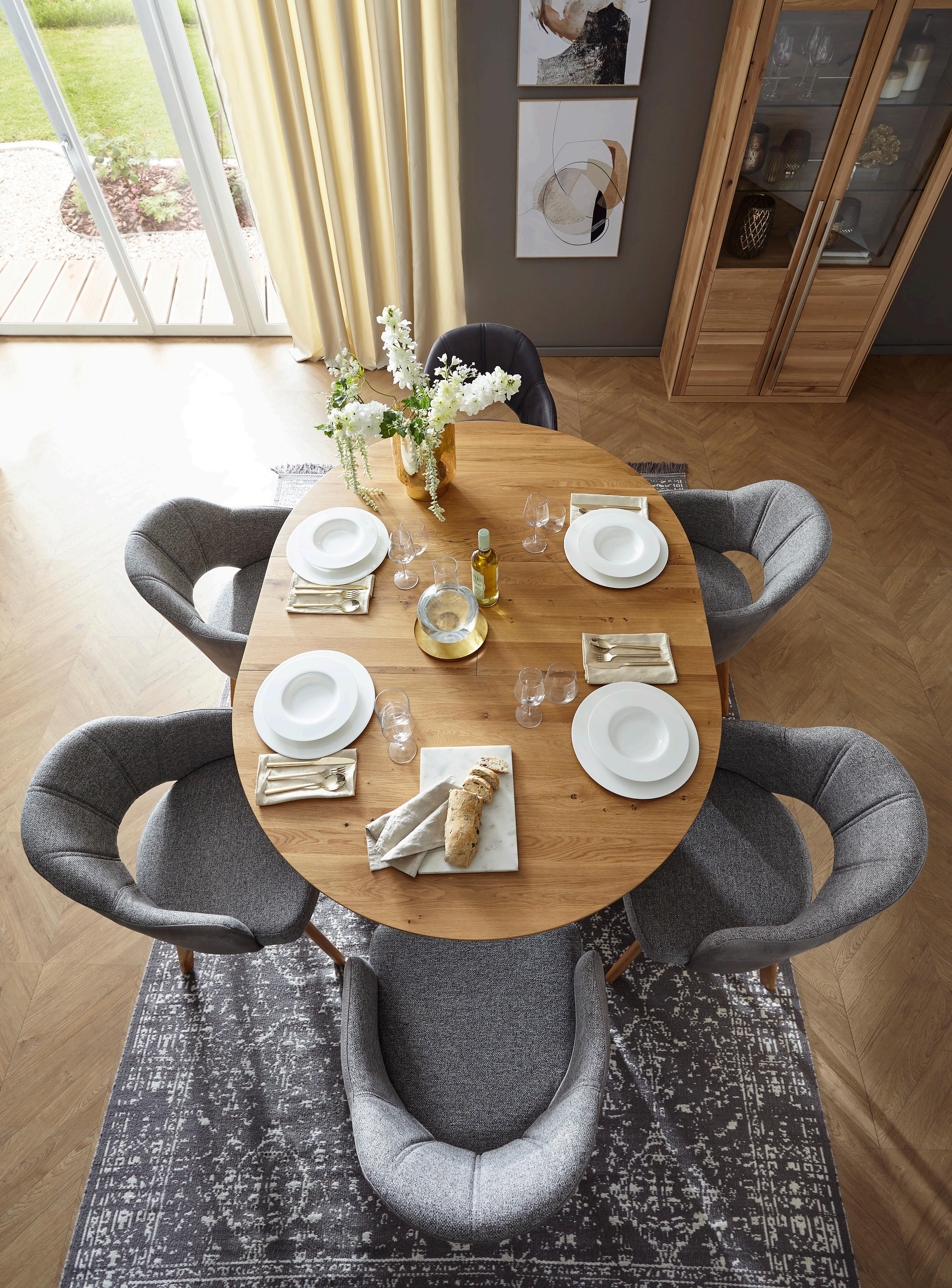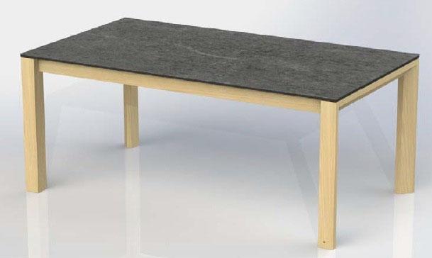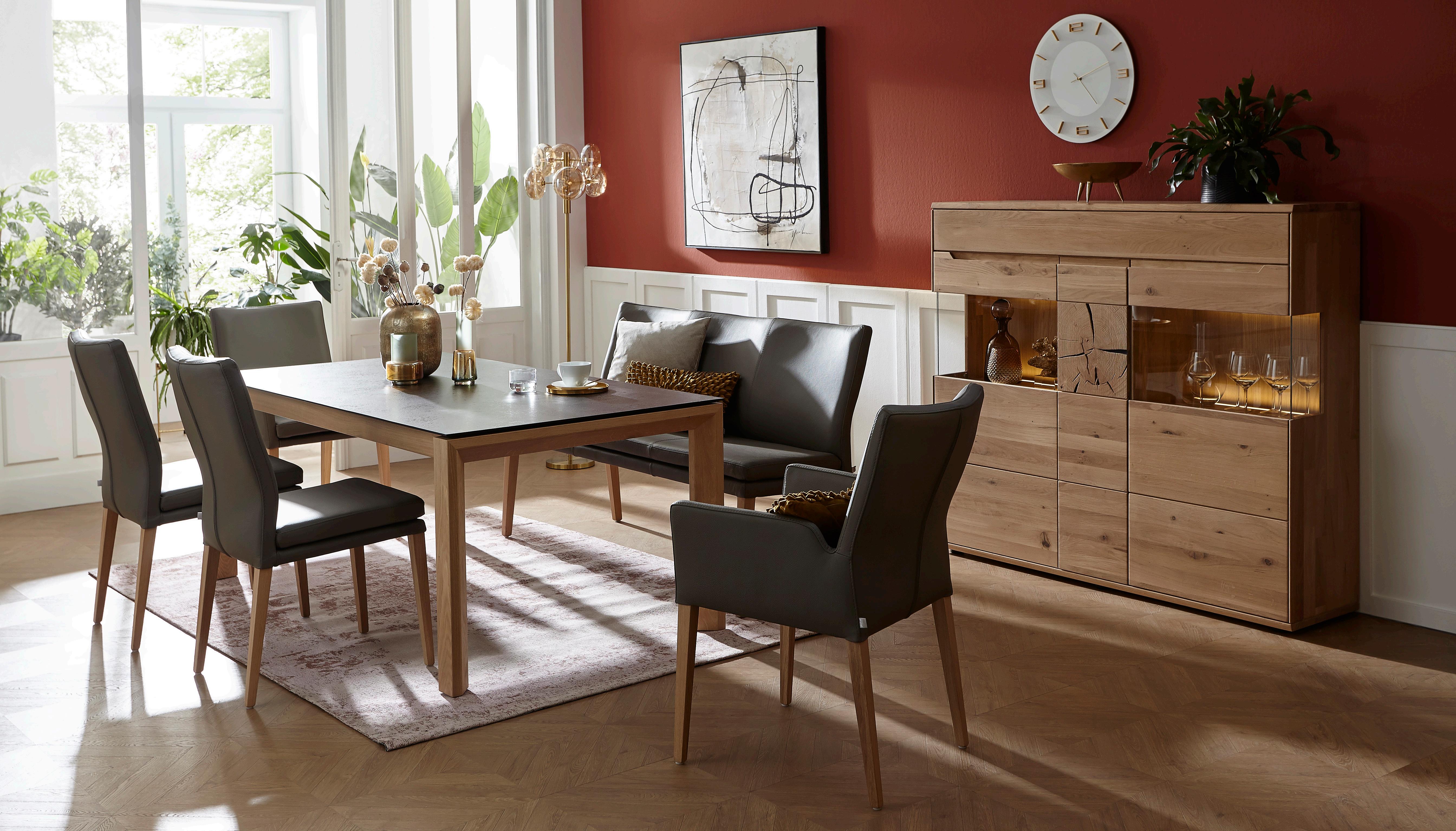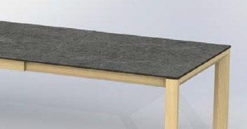 • Tischgestell aus Massivholz mit Dickschicht-Edelfurnier in „Wildeiche“ , „Eiche bianco“ und „Kernbuche (auch in Lack weiß, aber nur in Kombination mit Tischoberteilen in HPL)“.