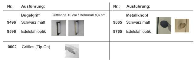 Griffvarianten Die in dieser Typenlisteangedeuteten Griffpositionen dienennur der Anschlagbestimmung. Die genaue Position derGriffewird anhand der vorliegenden Planung nachergonomischsinnvollen undtechnisch machbaren Maßstäben festgelegt.WerdenspezielleGriffpositionenvon Kundenseitegewünscht,müssen diese erst vom Hersteller auf Machbarkeit geprüft werden! Sollten diesemöglichsein, soist dieses deutlichauf derBestellungzu vermerken!