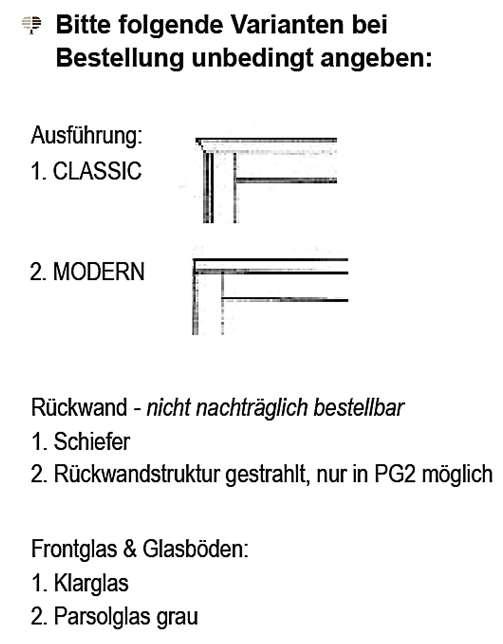 Seite) B/H/T in cm 185,2 / 100,2 / 48,7 Abb. CLASSIC B/H/T in cm 182,4 / 100,2 / 47,3 Abb. MODERN Rückwand gestrahlt, nur in PG2 möglich 323,00 195144 Rückwand Schiefer 238,00 238,00 195303 LED Einbaubeleuchtung 2x RIO 4,0 W 181,00 181,00 195002