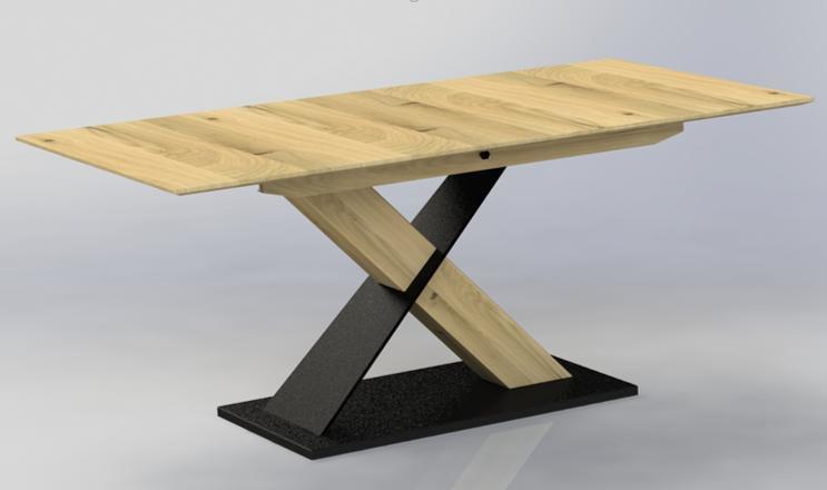 • Dieser Design-Tisch hat einen Synchronauszug und besteht aus einer in Charakter-Eiche furnierten Platte inkl. Softcorner. Das zentrale X-Gestell besteht aus einer Charaktereiche furnierten Säule und 1 geschwärzten Platte welche sich kreuzend in eine schwarze Bodenplatte übergehen. Unter der Tischplatte im Zargenkasten befindet sich eine innenliegende Einlegeplatten à 40 cm