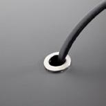 Kabelbohrung Durchmesser 8 cm, wird mit einer Kunststoffabdeckung geschlossen. Kunststoffabdeckung alufarbig, mit Öffnung für Kabel.