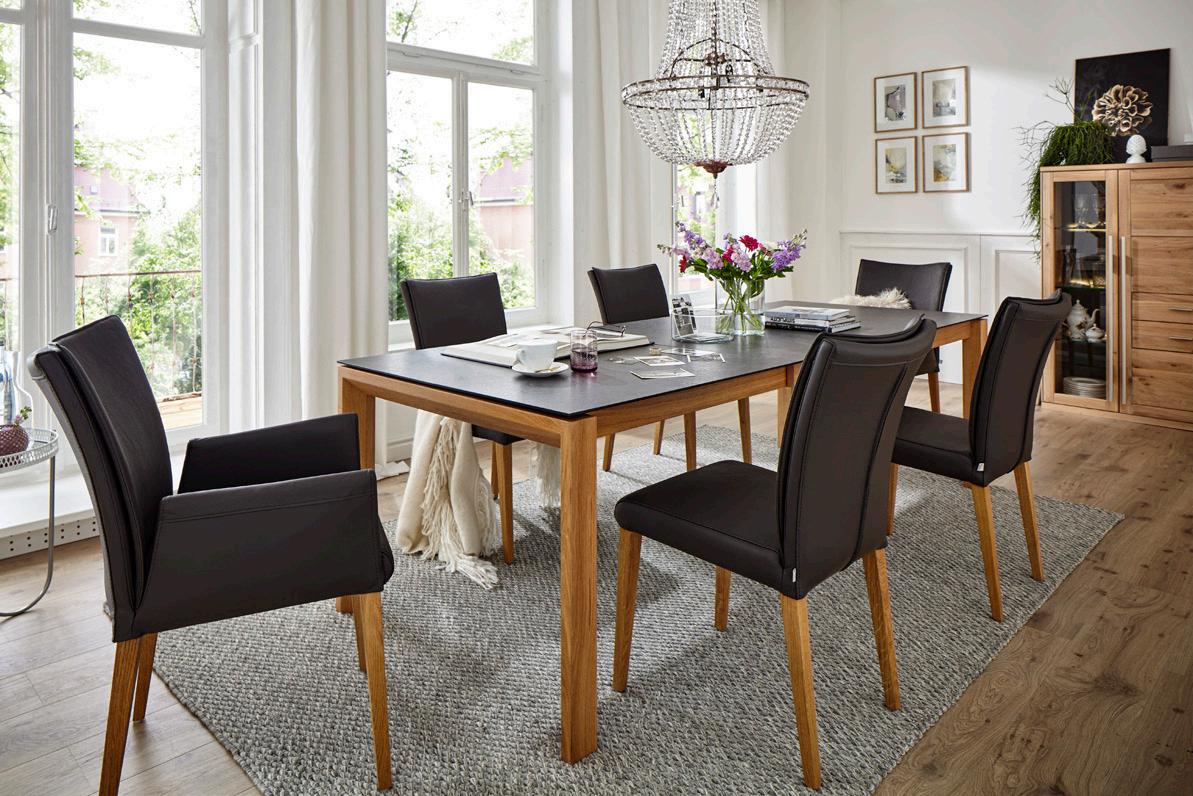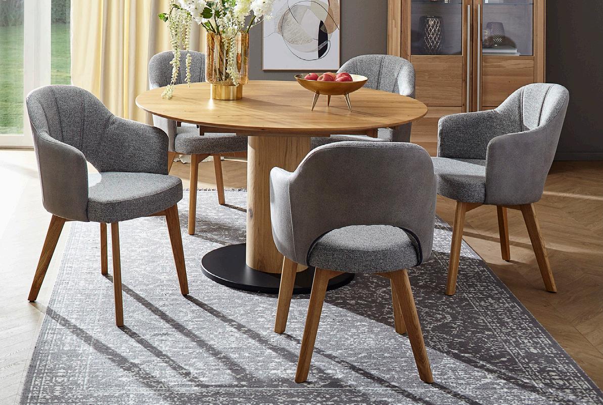 Ausführung: Platte und Gestell: Wildeiche massiv, lackiert Gestell: Säulenfuß furniert, Bodenplatte MDF Incl.schwarzSynchronauszug mit Verlängerungsplatte ca. 40 cm Beschreibung: Maße: DH ca. 130x77cm Preis in Armlehnstuhl1.998,002.250,00EUR*Werbepreis515247 257 Ausführung: Bicolor Bezug innen: Stoff Fiesta hellgrau Textilkennzeichnung:78% Polyester, 22% Rayon, Bezug außen: Microfaser Struktur schlamm Textilkennzeichnung: 100% Polyester Gestell: 4-Fuß Wildeiche massiv Beschreibung: Maße: BHT ca. 50x92x54cm Preis in EUR* je317,00298,00 Werbepreis