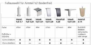 Bei allen mit gekennzeichneten Elementen sind Kürzungen in 10-cm-Schritten möglich. Bitte beachten Sie den jew. Aufpreis unter dem Element und geben Sie Ihr Wunschmaß an. Weitere Sonderanfertigungen sind auf Anfrage gg. individuellen Mehrpreis möglich. Bitte beachten Sie, dass es trotz der Maßanfertigung zu den üblichen und zulässigen DIN-Toleranzen kommen kann und diese nicht zur Beanstandung berechtigen. preisgleich preisgleich Kopfteilverstellung optional gegen Aufpreis erhältlich. Bitte bei Bestellung angeben und Aufpreis unter dem jew. Element beachten. -V1 AT 2 HINWEIS: Bei Kopfteilverstellung höhenverstellbar ist keine "maßgenauKürzung" möglich. Sonstige Sonderanfertigungen auf Anfrage zum Aufpreis lt. Preisliste möglich optional kann die Kopteilverstellung höhenverstellbar bestellt werden. Die Höhenverstellung ist bei ausgewählten Elementen wahlweise manuell oder motorisch möglich. Bitte Typenplan beachten Fußauswahl für Armteil V1 (geschlossen) (bodenfreie Elemente haben immer 12 bzw. 15cm hohe Füße) matt matt mattglänzend glänzend Seite 1 von 12