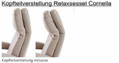 VK-Preisliste in € - gültig ab 15.06.2022 Sonderliste EMV-Global Modell Cornella Vital (mit Boxspring) RelaxsesselRelaxsesselCornella incl. Sitztiefe:Sitzhöhe:B/H/T:m.DrehfußKopfteilverstellung-Sternfuß(Metall)68/109/85cm46cm55cmNr.11178 StoffgruppeI 1.700 II 1.768 III 1.838 IV 1.939 V 2.027 VI 2.118 Ledergruppe2 1.983 4 2.130 6 2.271 8 2.557 Fußvarianten (ggf. Aufpreis beachten) Fußvarianten Relax- und Einzelsessel CORNELLA Lederbezug)StoffSchwarz(Metall,TellerfußMetallSternfußHolz,oderbzw.Verstellung/Antrieb (ggf. Aufpreis beachten): VerstellungmotorischeAkkuset(2verstellbarmotorischVerstellungfürFeststellhebelverstellbarmanuellmanuelleMotoren)für Relaxsessel Standardfuß /HINWEIS:preisgleich149Der Relaxsessel Cornella ist ein universeller Einzelsessel und kann als Ergänzung zu allen Modellvarianten bestellt werden. Die Optik, Varianten und Sitzausführung ist nicht an das jeweilige Modell angepasst. Standardausführung173 / preisgleich70585 (aluMetallsilberDrehfußStandard:Sternfußpoliert) Drehfußoptional: (edelstahlMetallsilberTellerfußgebürstet) Drehfußoptional: Struktur)(pulverbeschichtetMetallschwarzTellerfuß Drehfußoptional: Tellerfuß Holz (buche) in den Beiztönen eiche, buche natur, wenge oder nussbaum Seite 8 von 9 Cornella Vital 29