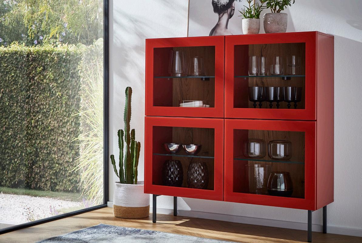 Korpus und Front: Lack safranrot, PG. B, Füße: Sockelfüße 9740, mit Tip-On-Beschlag, Rückwand Balkeneiche natur echtholzfurniert