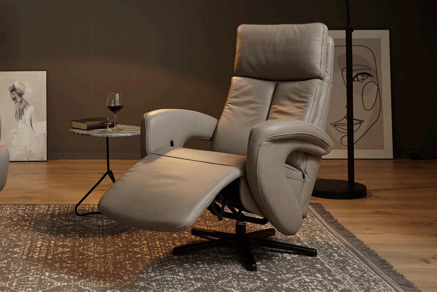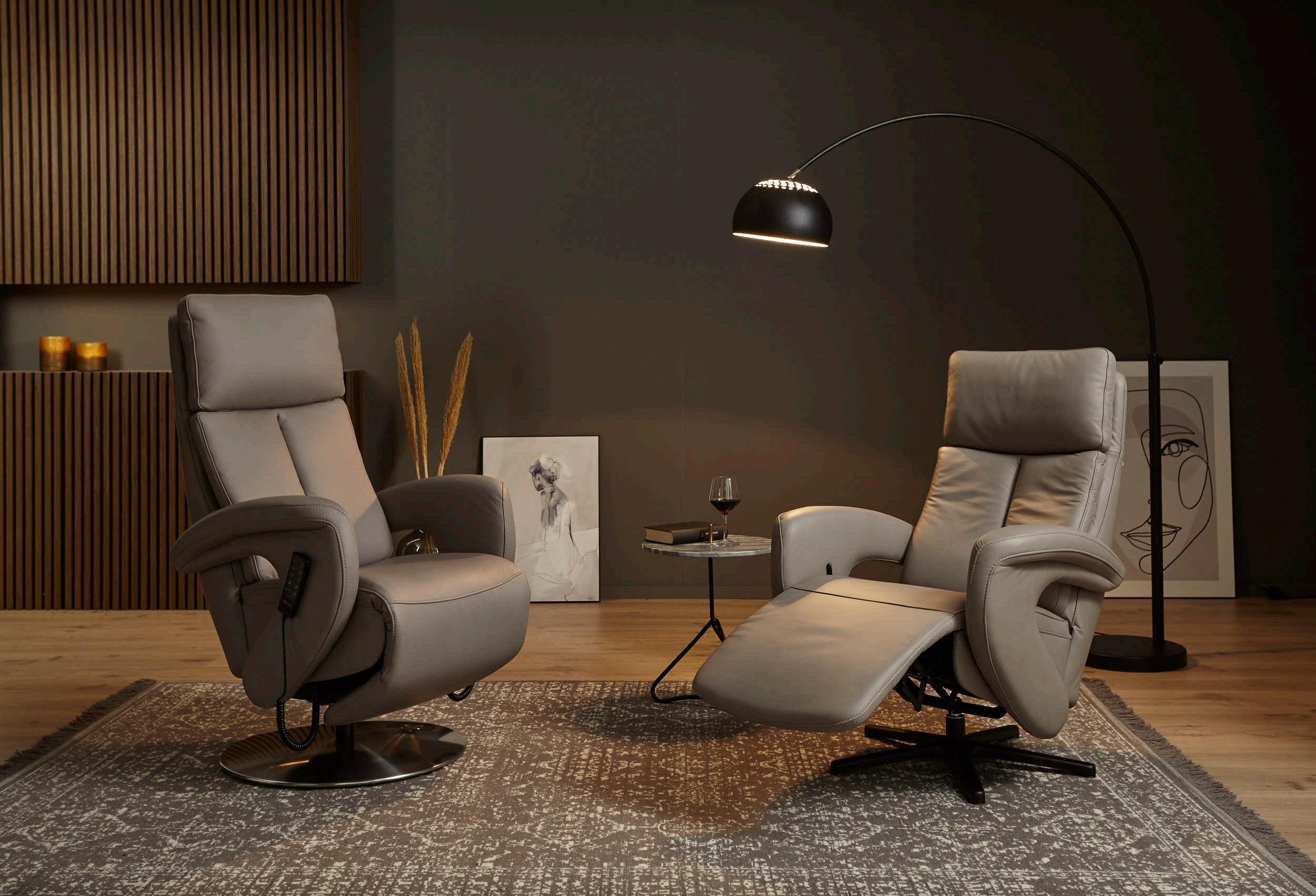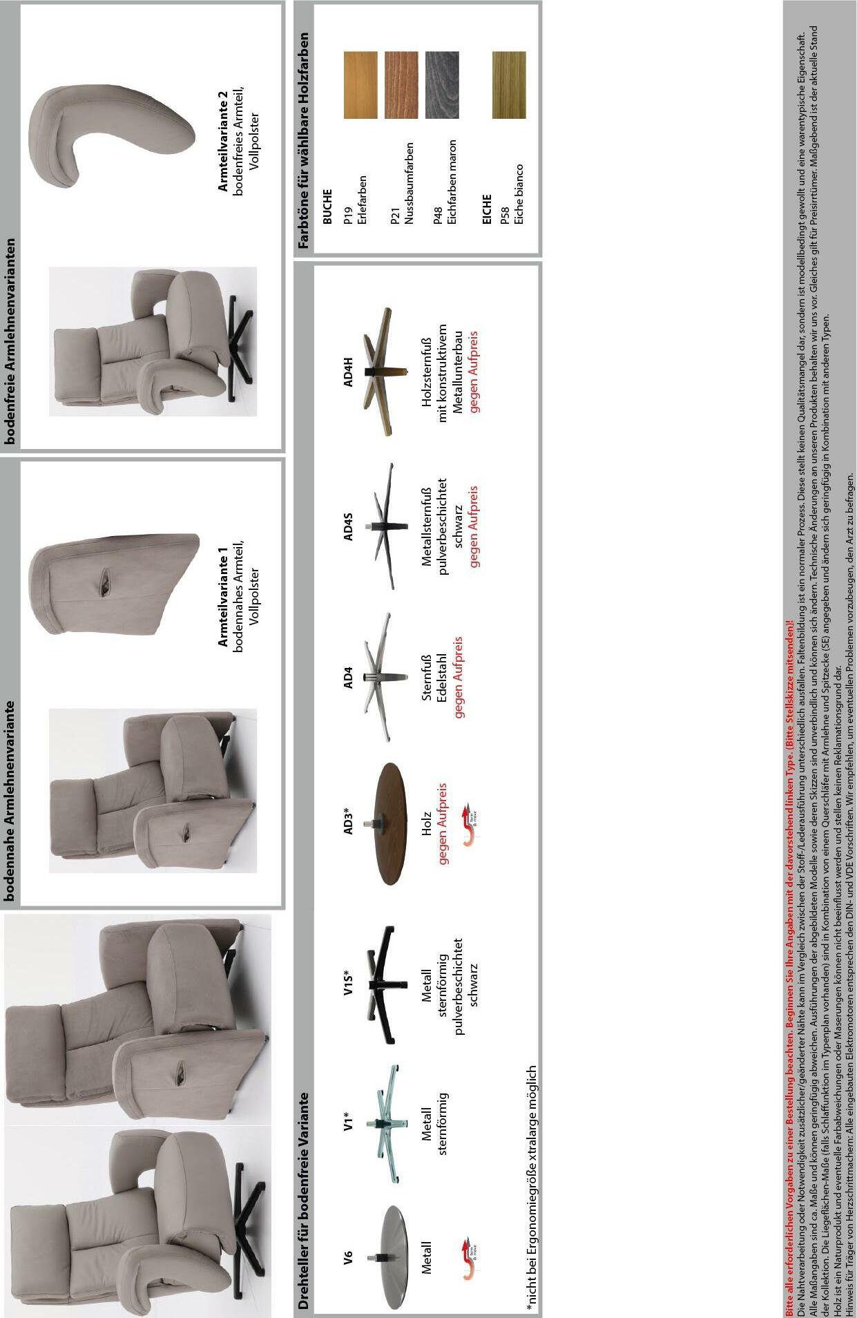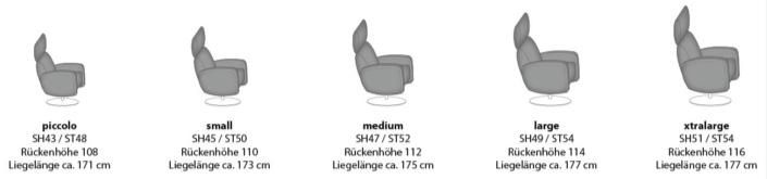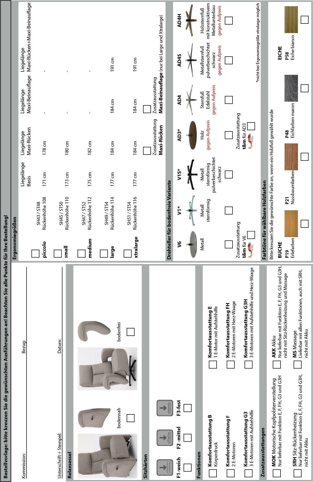 Individuelle Verstellung der Beinauflage und Rückenlehne bis zur Herz-Waage Position durch 2 Elektro-Motoren und zusätzlich 1 Elektro-Motor für die Aufstehhilfe (max. 120 kg). Mit fixierbarer Drehfunktion bei der bodenfreien Variante. Bodennahe Variante generell ohne Drehfunktion. Bei der bodenfreien Variante in der Ergonomiegröße Piccolo erhöht sich die Sitzhöhe um 2 cm. Generell mit manueller Kopfpolsterverstellung ausgestattet.