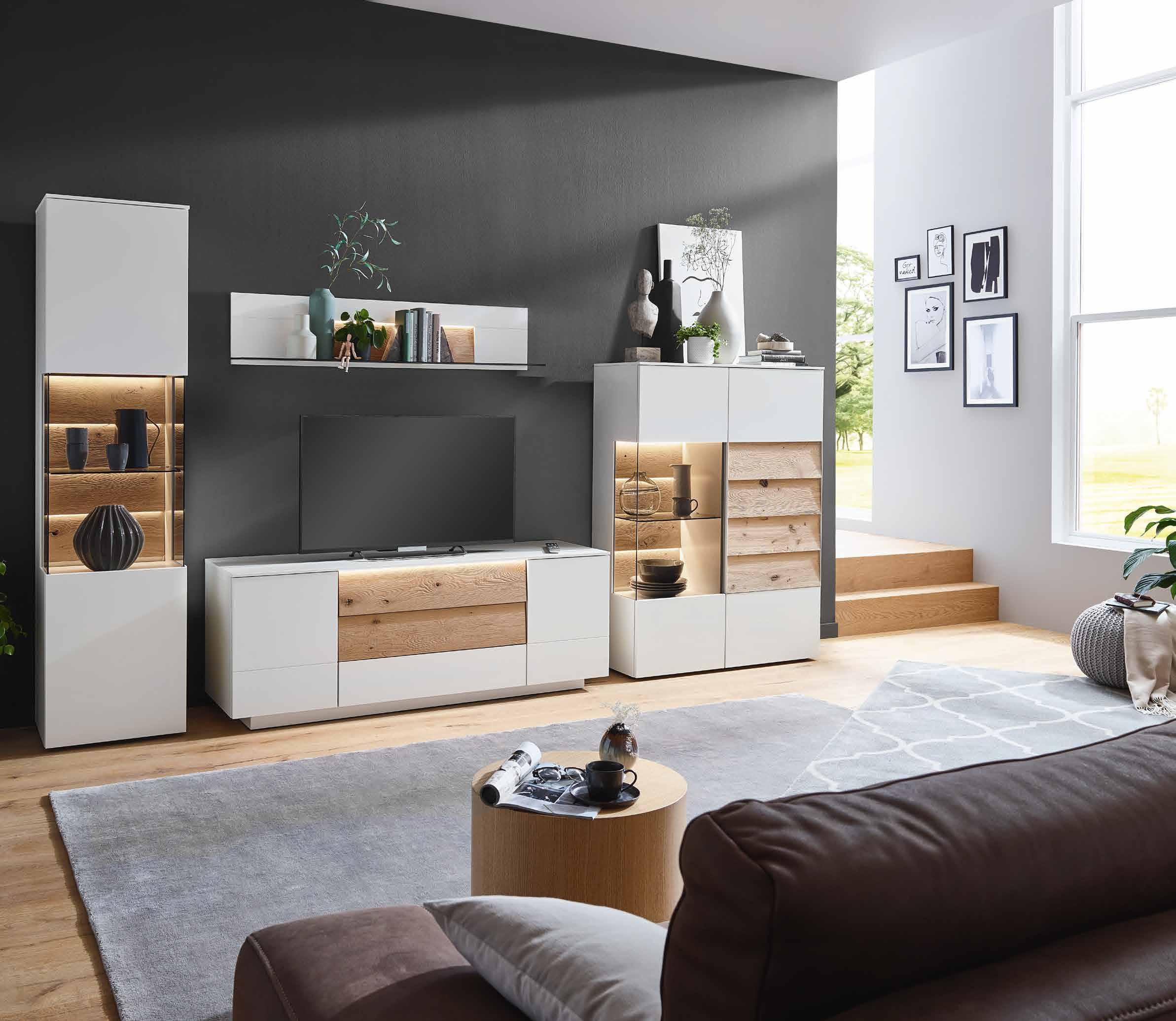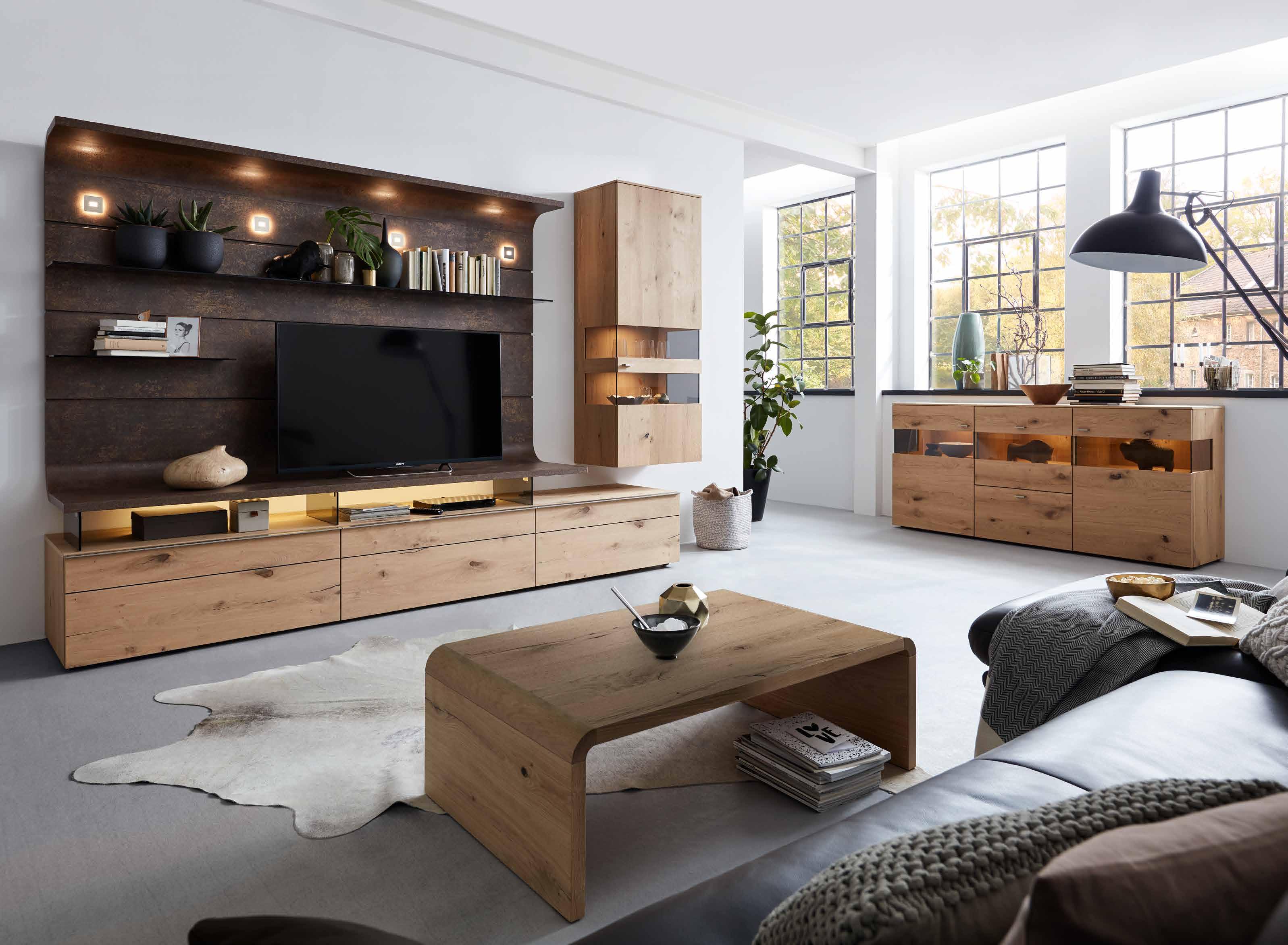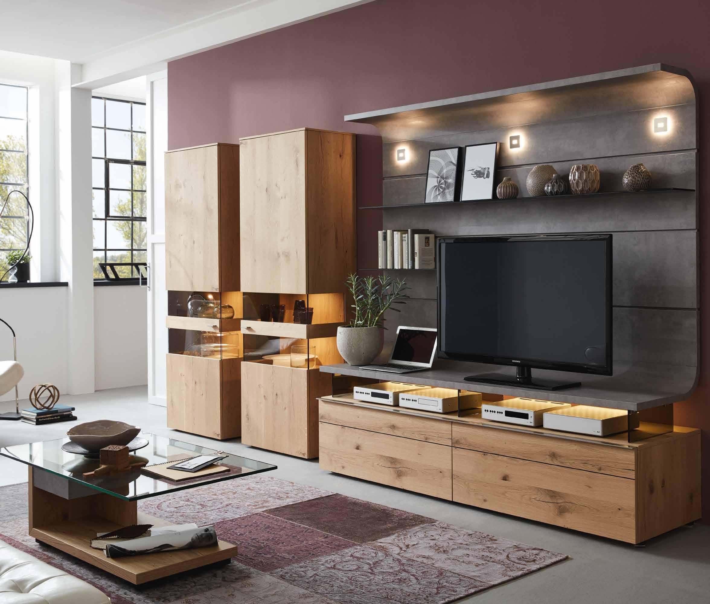 Characterised by a timeless elegance, with deliberate accents in grained wood, nature takes centre stage with FIERA, radiating cosy warmth in every living space. The combination of lacquered surfaces and sustainable yet sophisticated veneer individually defines modernity, and shapes the distinctive appearance of FIERA. This is further enhanced by integrated lighting in the wall panel, while the panels themselves provide a wide range of design solutions for your living space.
