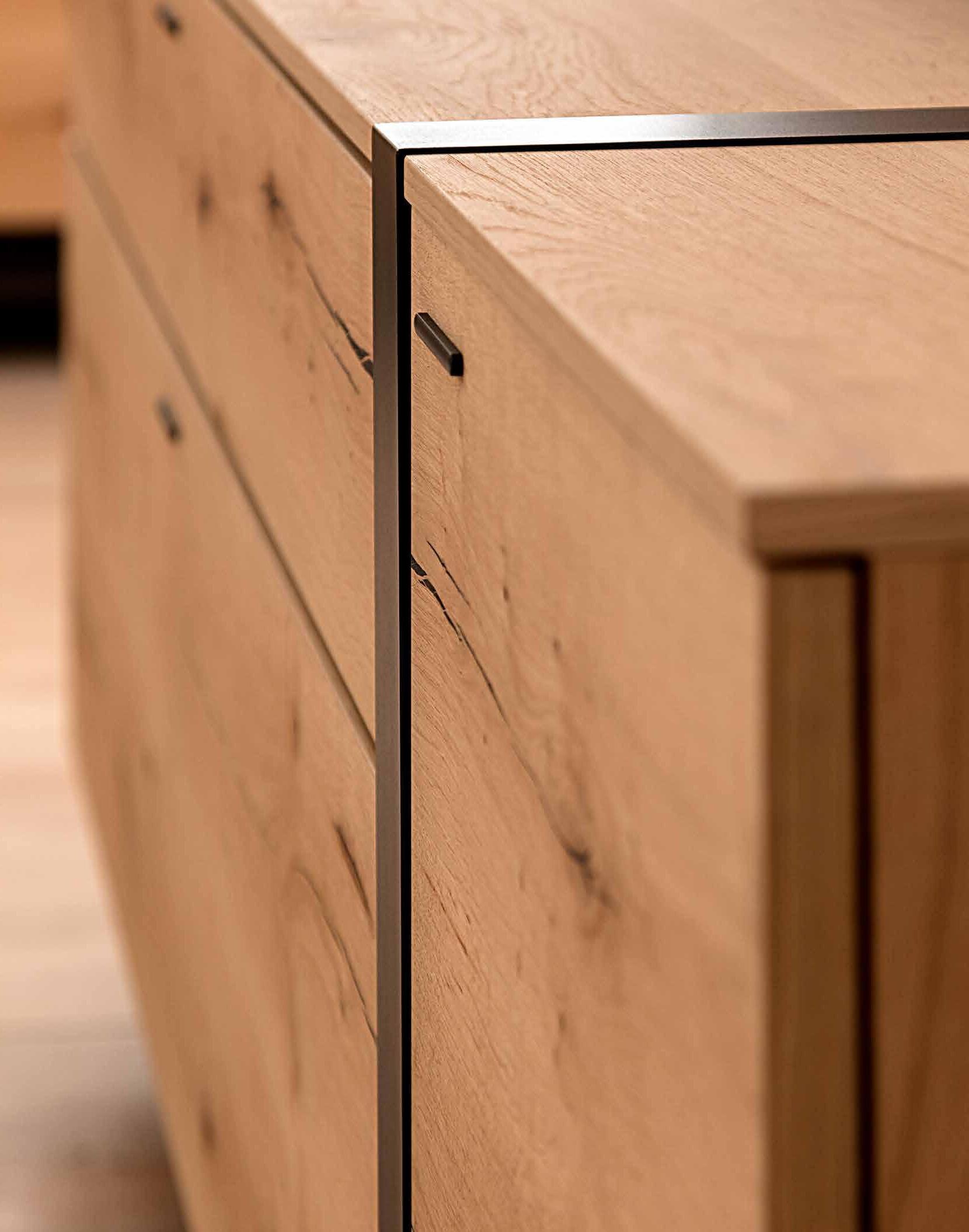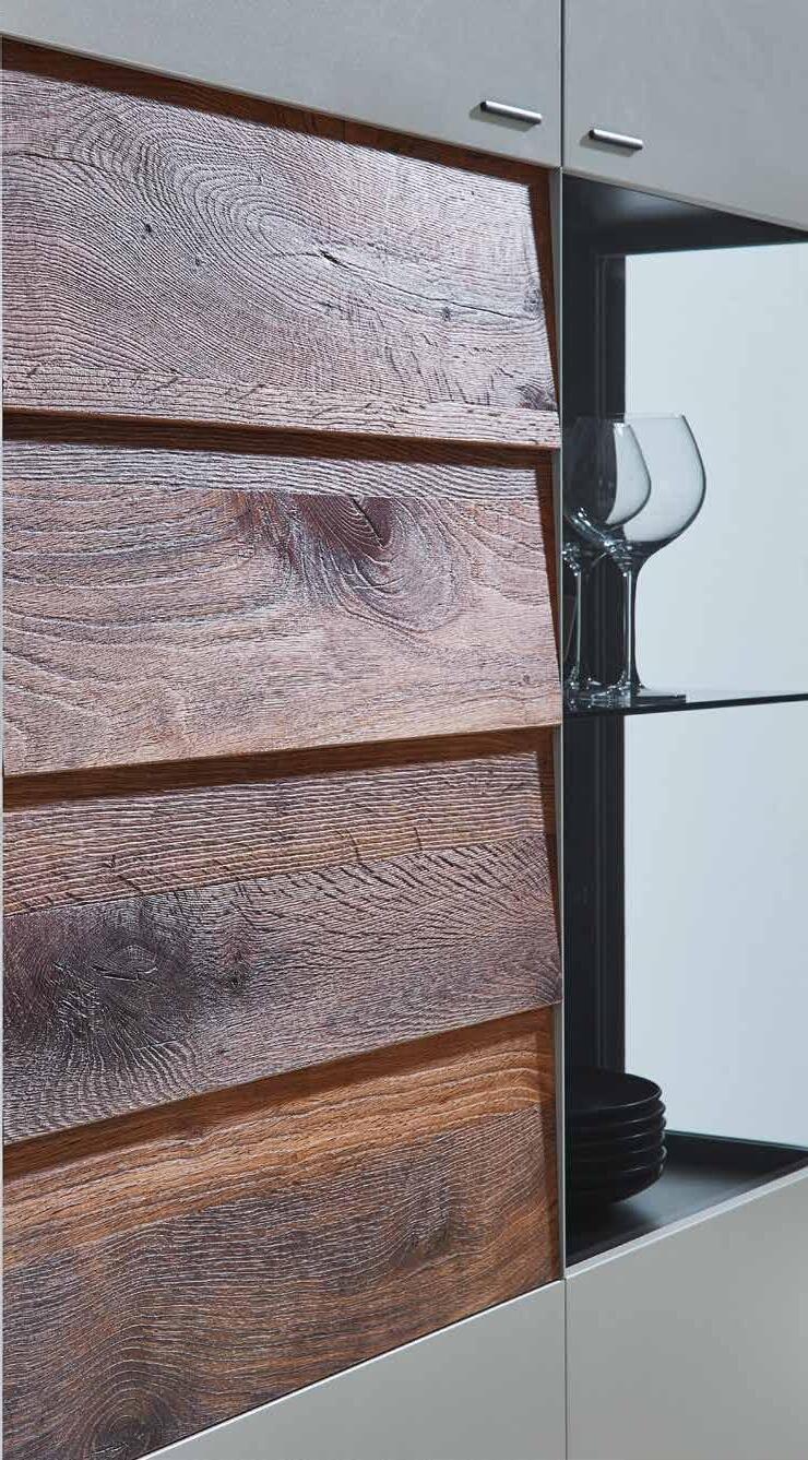 The natural charm of solid brushed, oiled wild oak or textured terra oak timber combined with lacquer exudes enchanting elegance. The furniture structure and handless design on the doors and drawers (push-to-open technology) add a feeling of lightness and elegant design. The seemingly continuous wall panel creates a harmoniously spacious unit.
