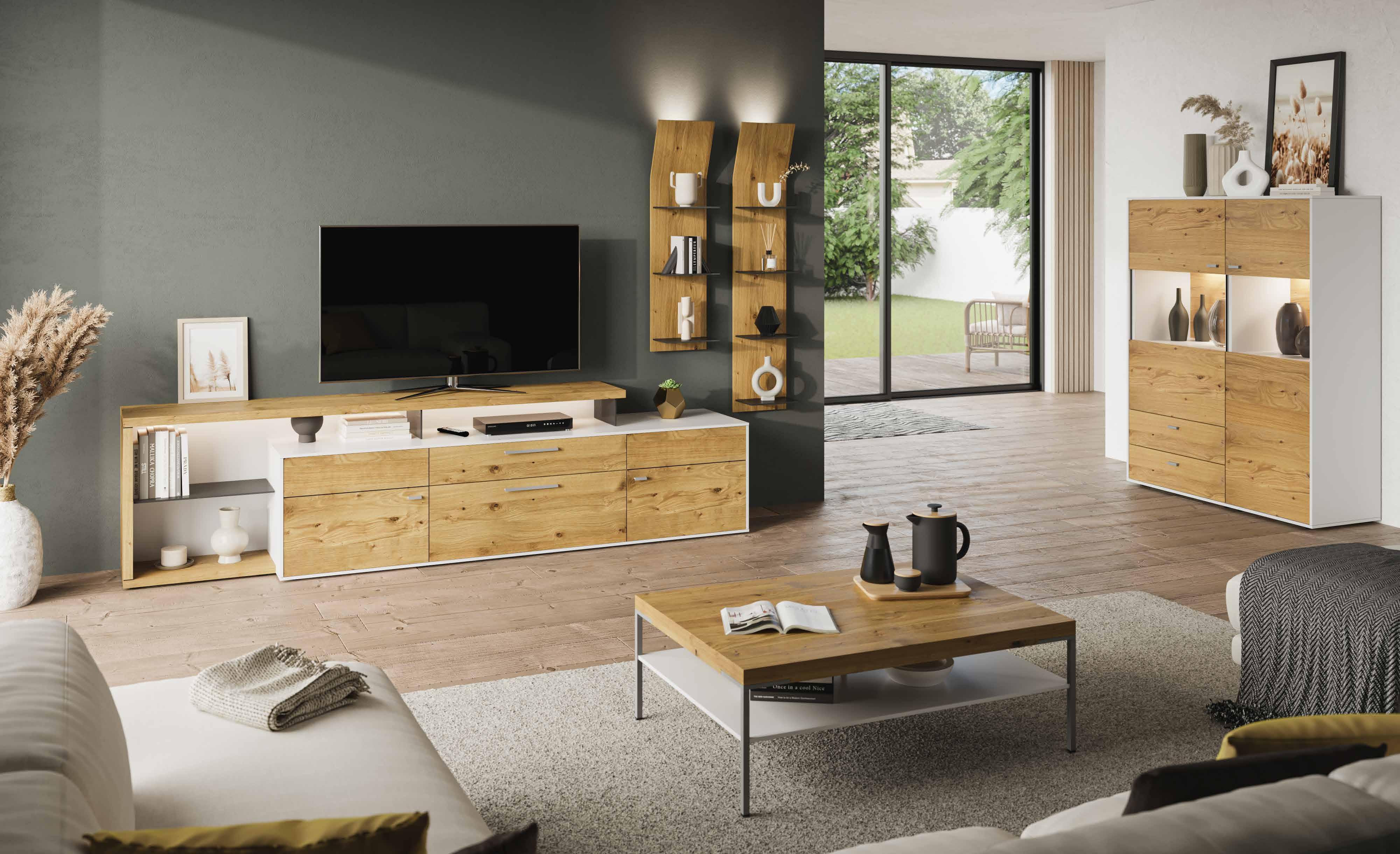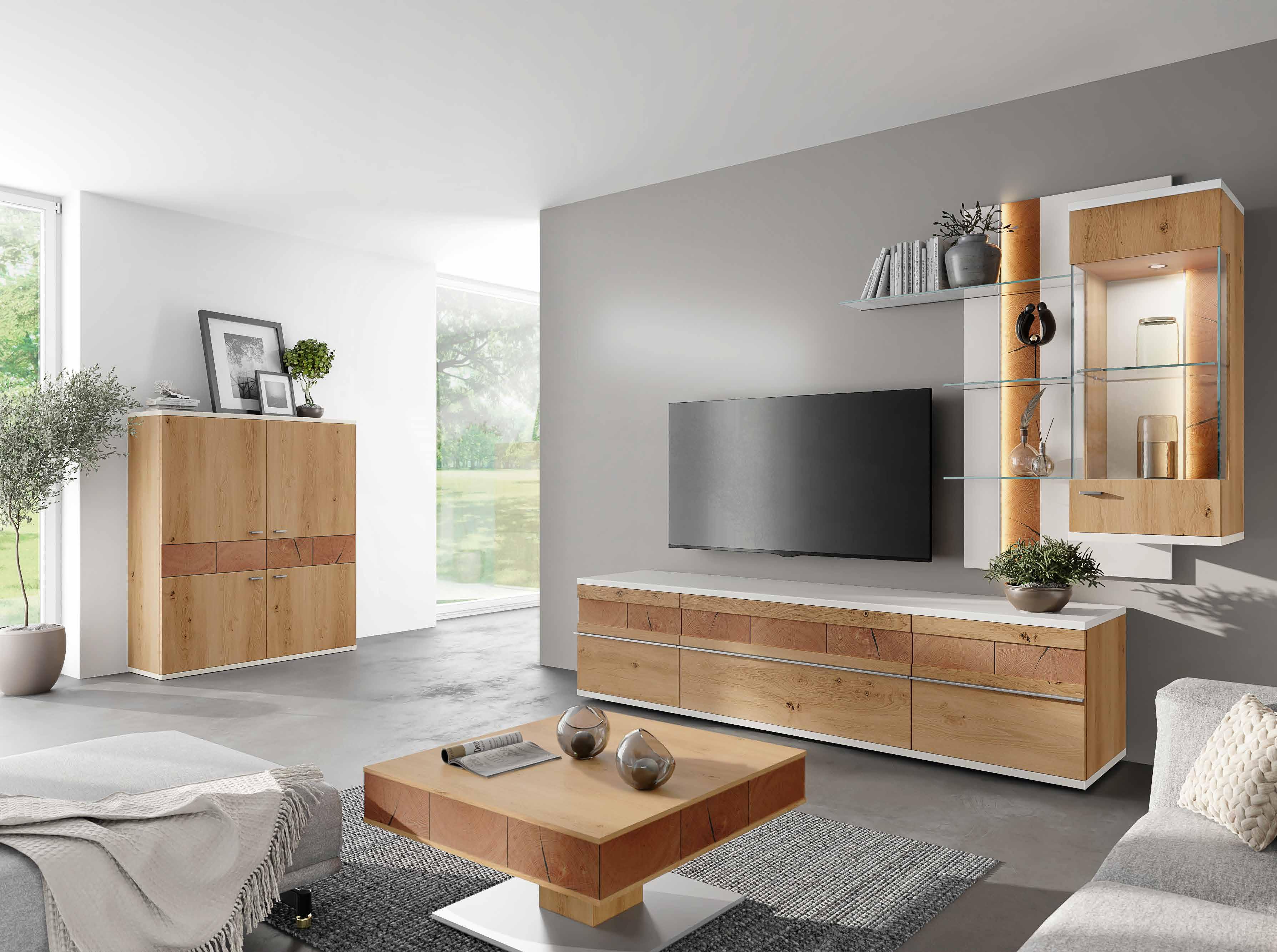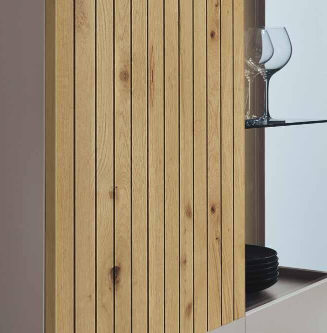 MISANO zeichnet sich durch eine natürliche Eleganz, geprägt vom sensiblen Zusammenspiel von Echtholz, Lack und Glas aus. Durch die moderne Querbetonung von Massivholzelementen, die mit Licht gezielt in Szene gesetzt werden, bringen abgestufte Bereiche die markante Holzstruktur besonders zur Geltung und erzielen eine beeindruckende Tiefenoptik.