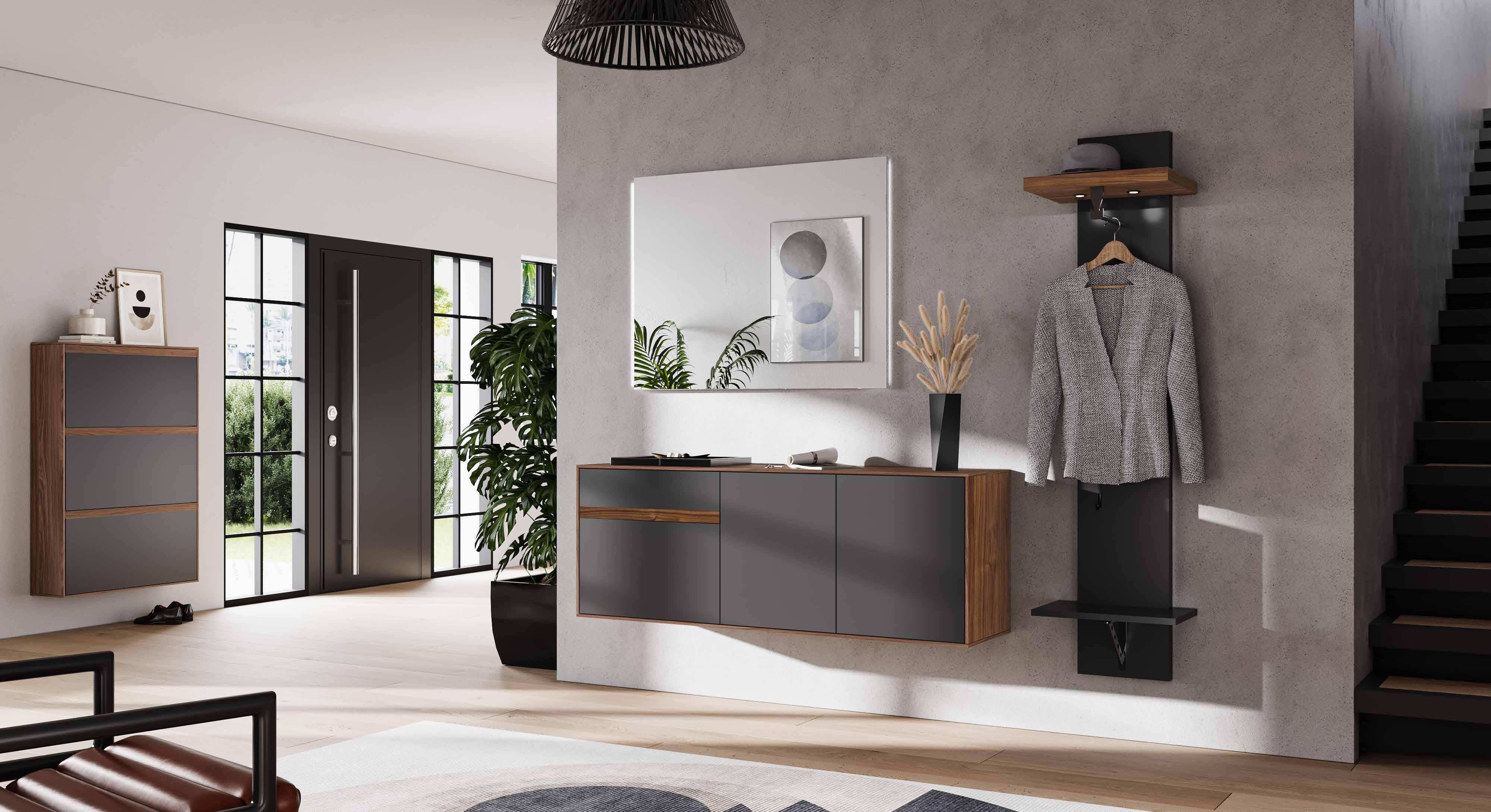 Wahlweise in Holz- oder Lackumrahmung, mit oder ohne Holzakzent in der Front überzeugt das Modell in seiner schlichten Eleganz. Kreieren Sie beliebig viel Stauraum, hinter Türen und Schubladen oder ganz raffiniert mit dem Schuhkipper mit Metallkörben.
